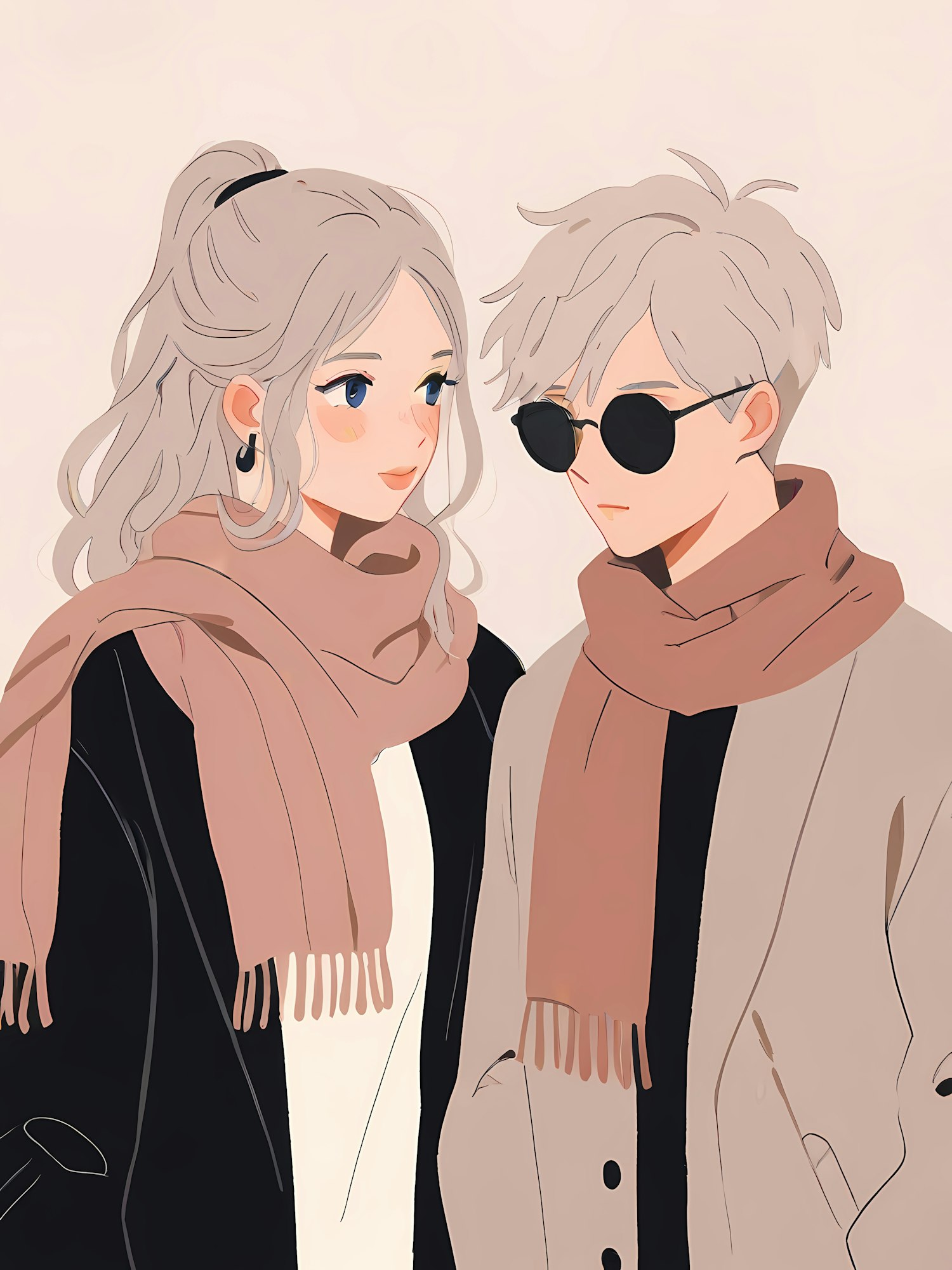 Chic illustration of a stylish couple in winter fashion, featuring cozy scarves and trendy outerwear.