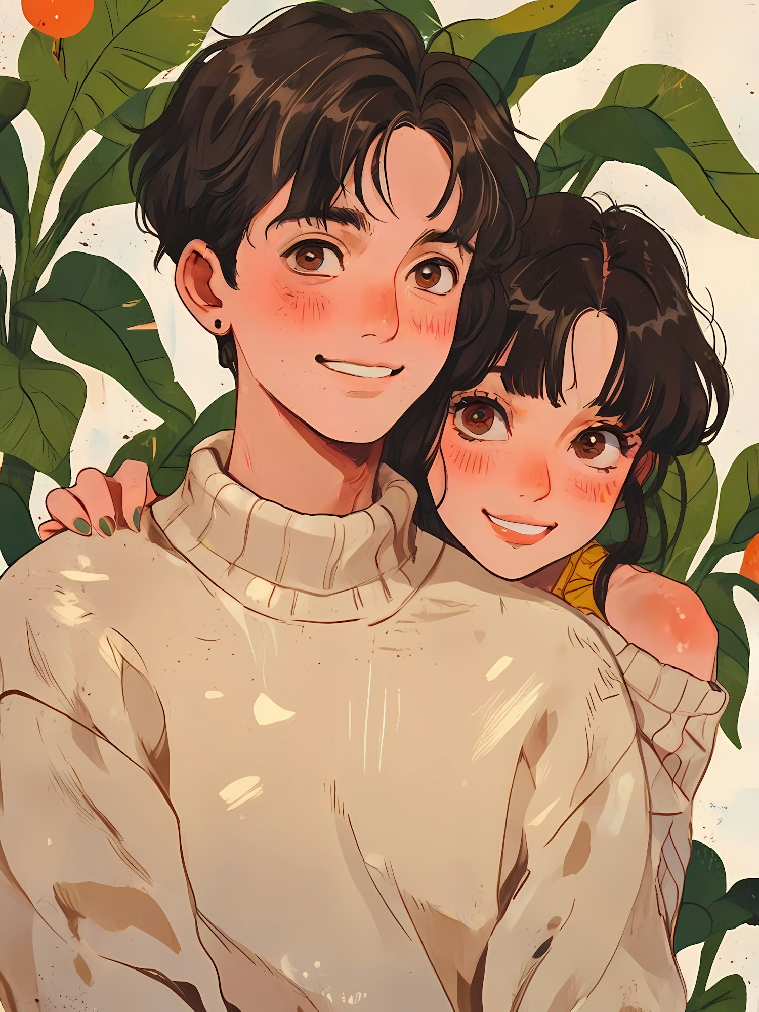 Illustration of a smiling couple with lush green leaves and orange fruits in the background, exuding warmth and affection.