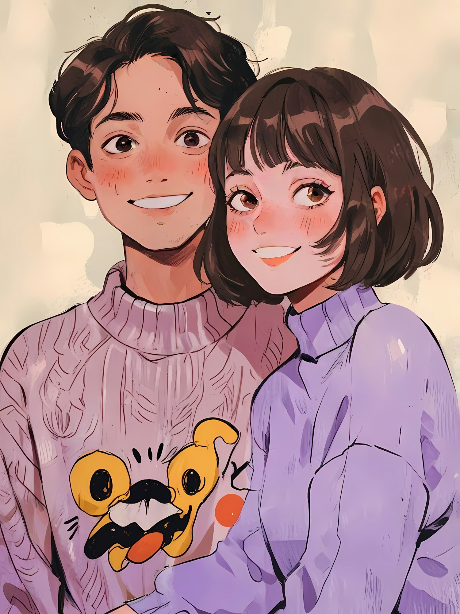 Illustration of a smiling couple in colorful sweaters, featuring playful designs and warm expressions, set against a soft background.
