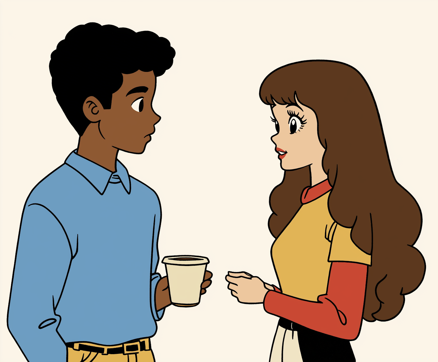 Cartoon illustration of two characters talking, one holding a cup. Engaging expressions and colorful outfits highlight their interaction.