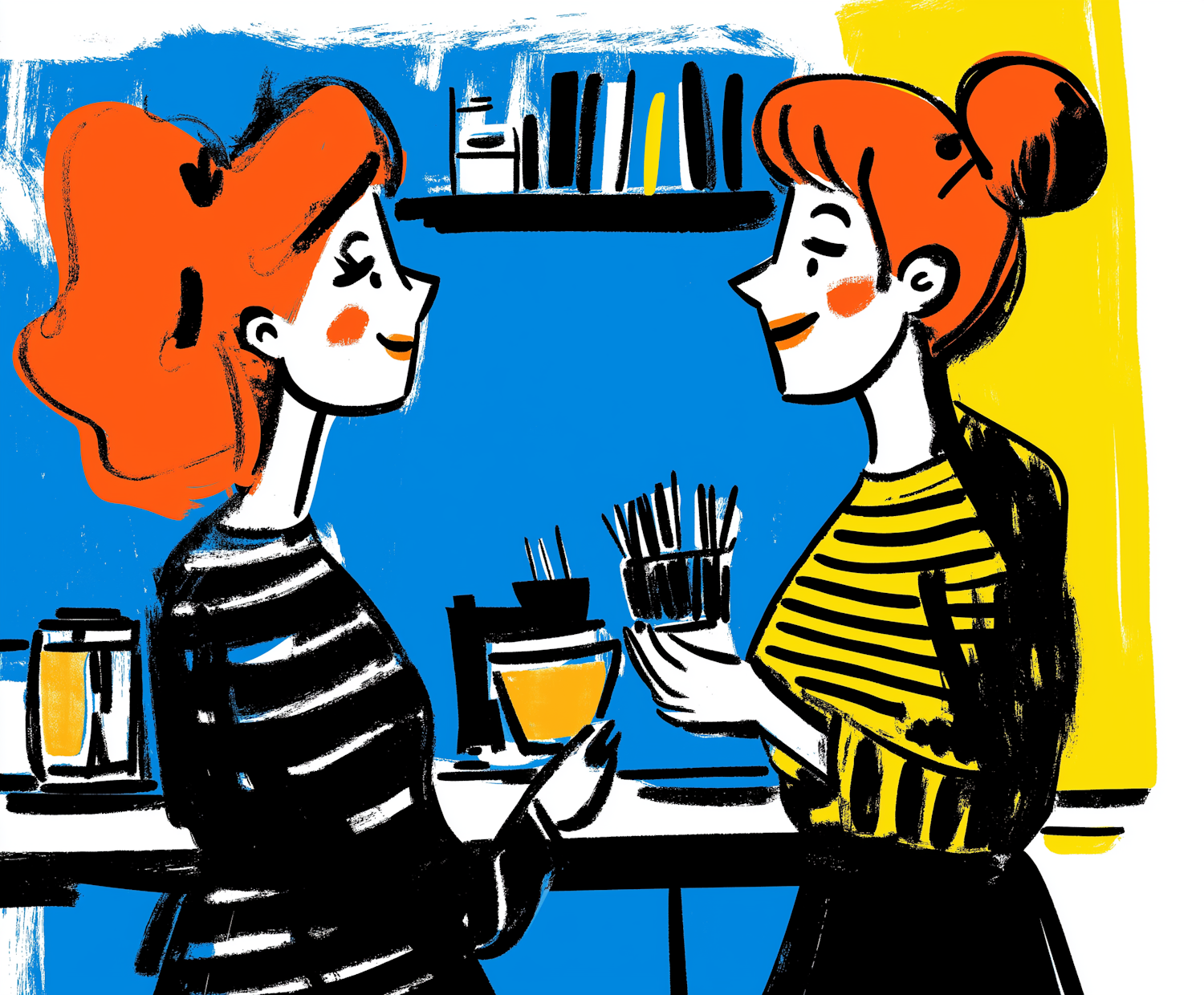 Two women with red hair chat in a colorful cafe setting, wearing striped tops. Bold colors and lines create a lively atmosphere.