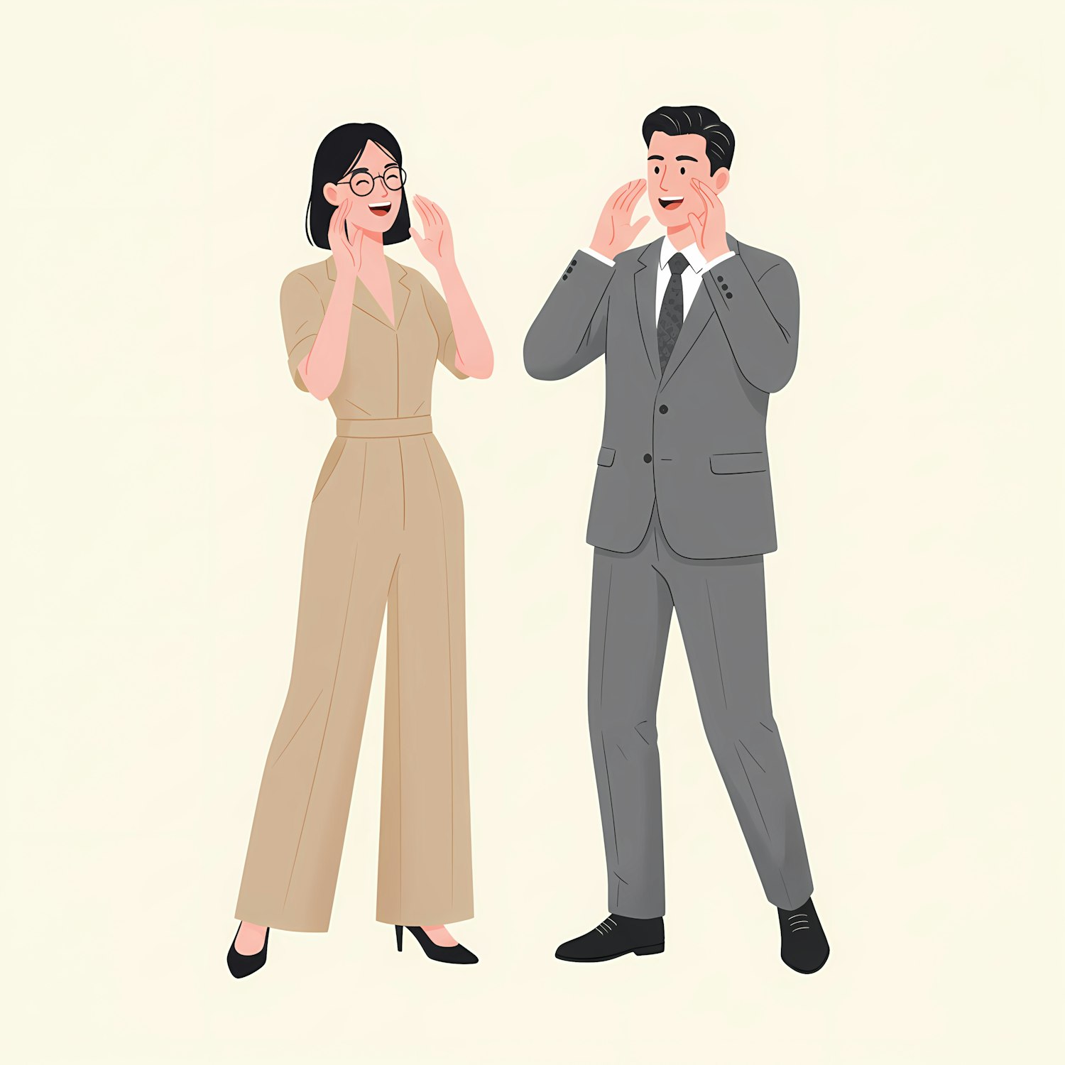 Illustration of a man and woman in professional attire animatedly conversing, set against a light background.