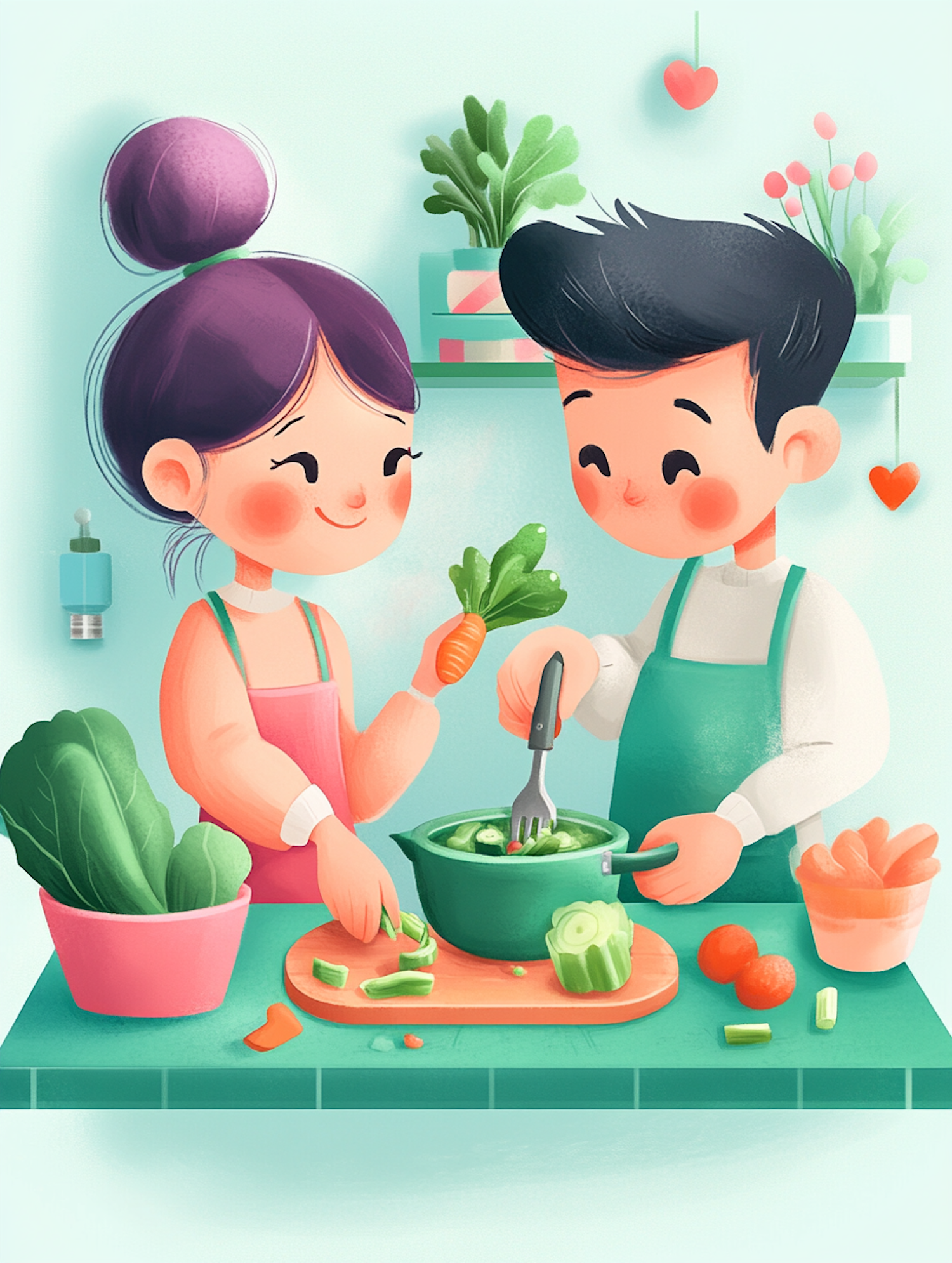 Cute illustration of a boy and girl cooking together with fresh vegetables in a colorful kitchen setting.