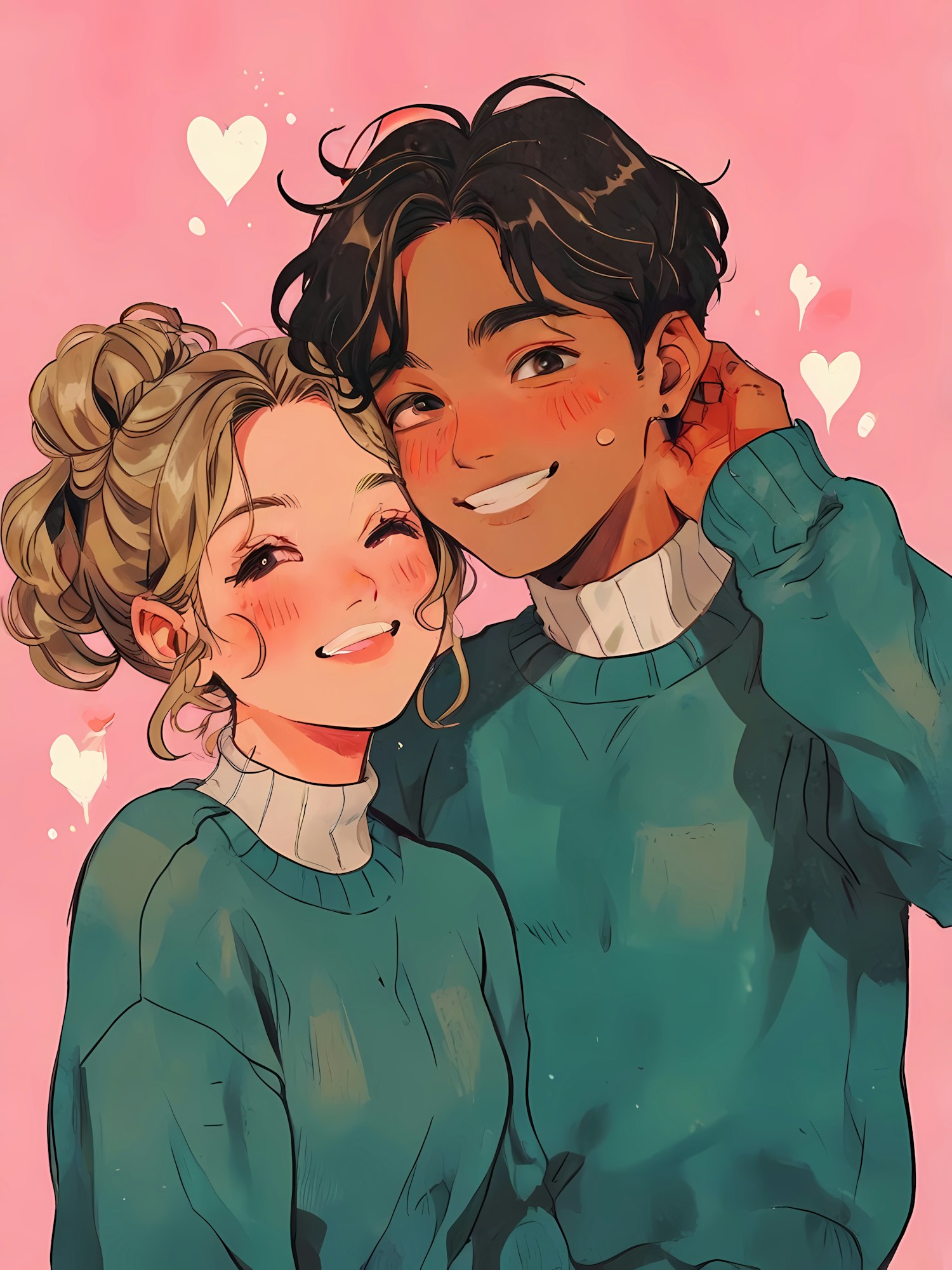Illustration of a smiling couple in matching teal sweaters against a pink background with hearts, exuding warmth and joy.