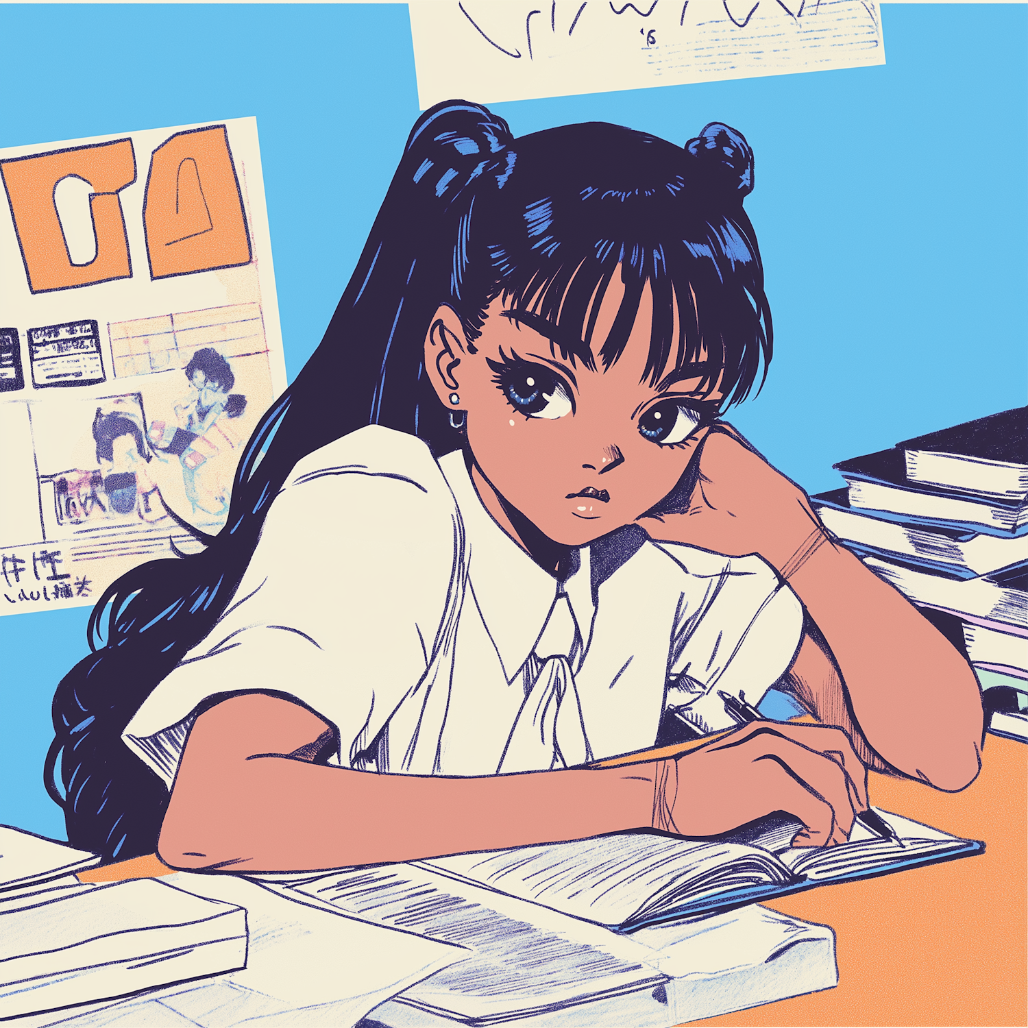 Anime-style illustration of a girl studying at a desk, surrounded by books and papers, with a focused expression.