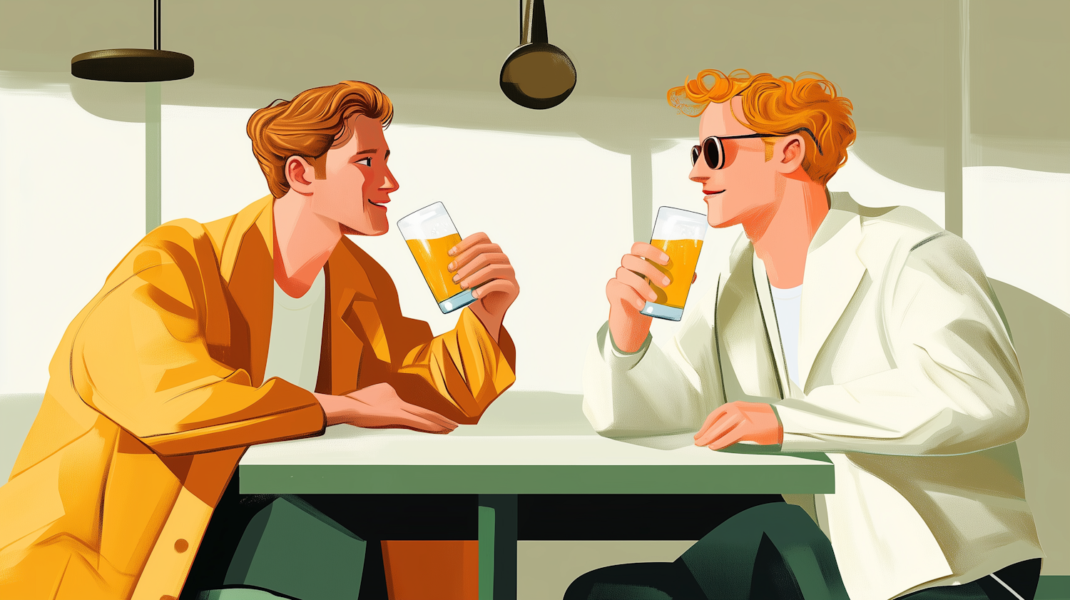 Two stylish men enjoy drinks at a modern cafe, sharing smiles and conversation. Bright colors and minimalist design create a warm atmosphere.