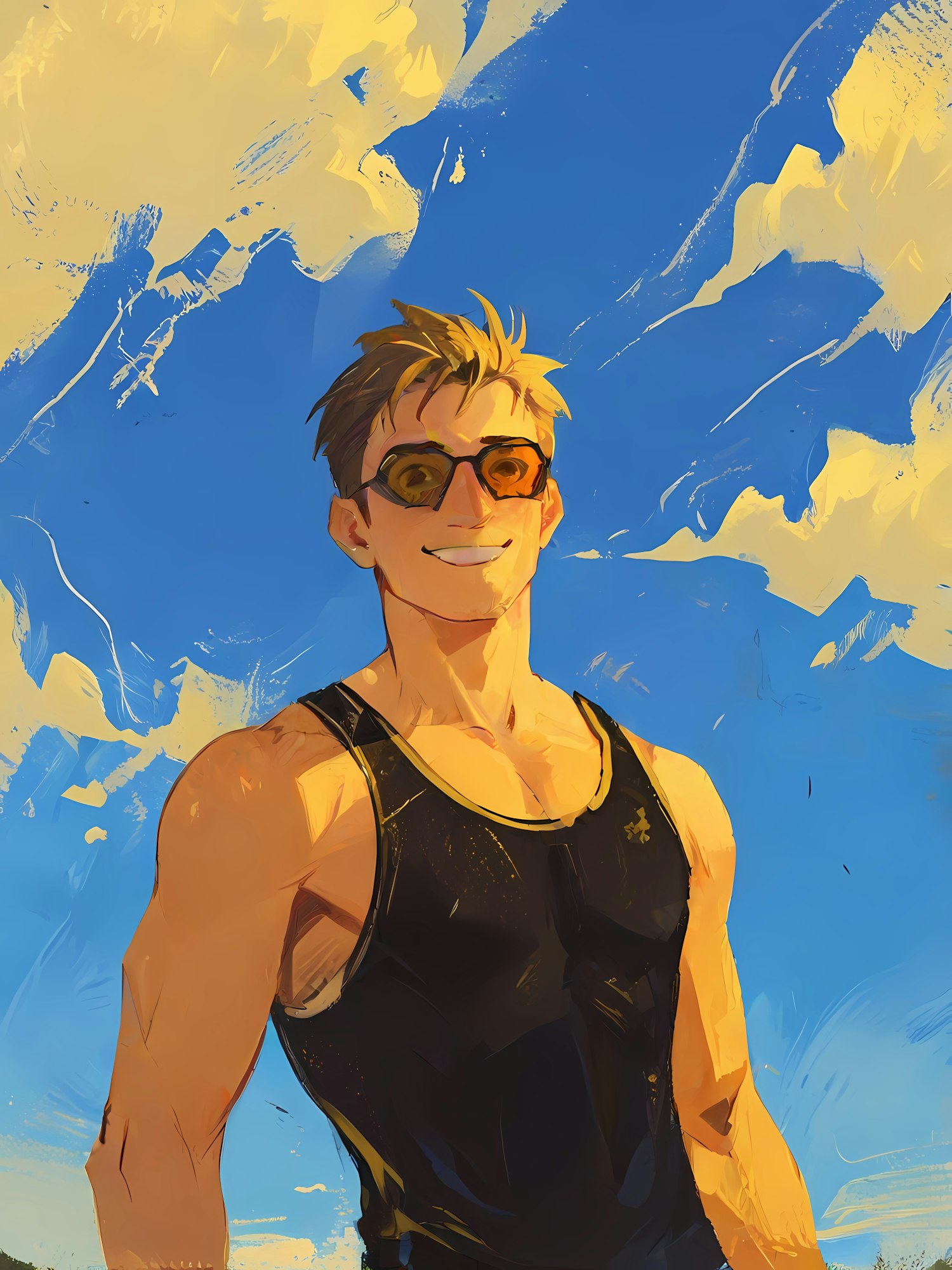 Colorful stylized illustration of a young man wearing sunglasses under a bright sky with dynamic yellow clouds. Vibrant and summer-themed.