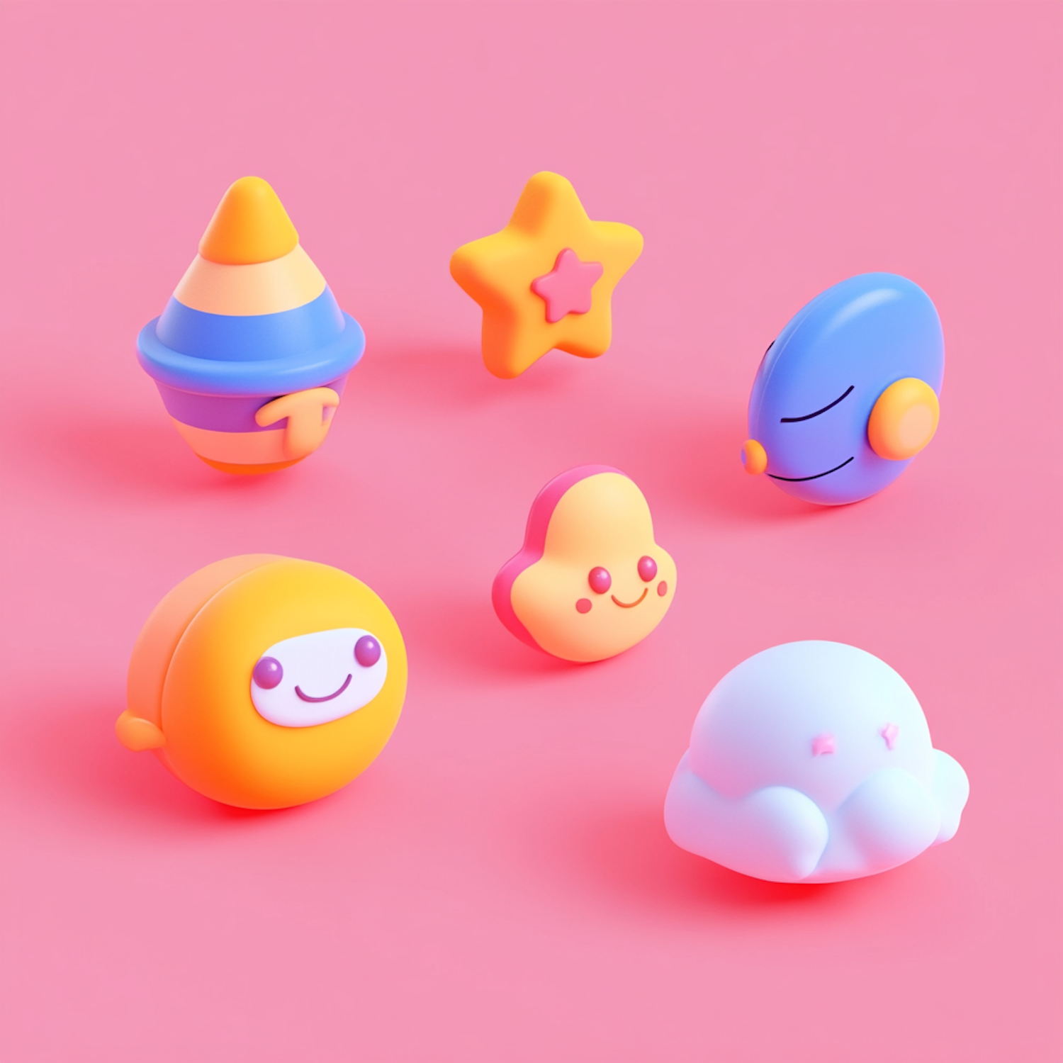 Colorful 3D cartoon objects on a pink background, featuring stars, hearts, and playful characters.