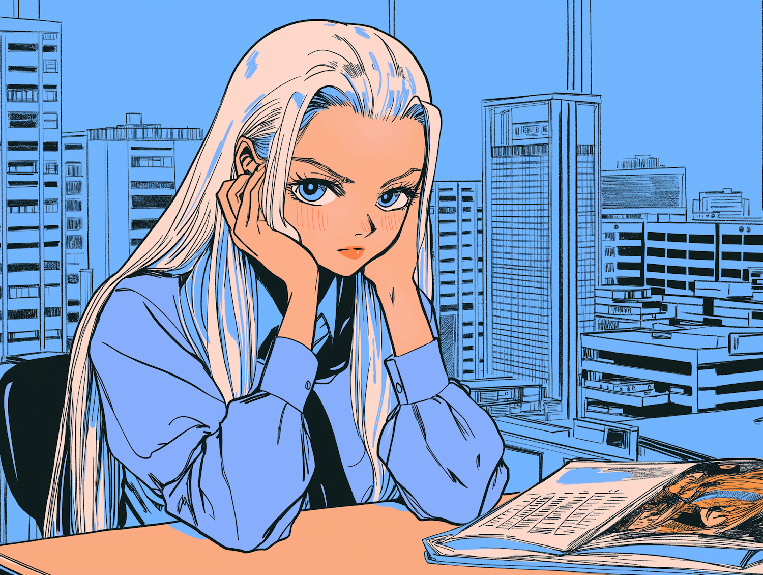 Stylized illustration of a young woman with white hair and blue eyes, sitting at a desk with a cityscape background. Modern and vibrant.