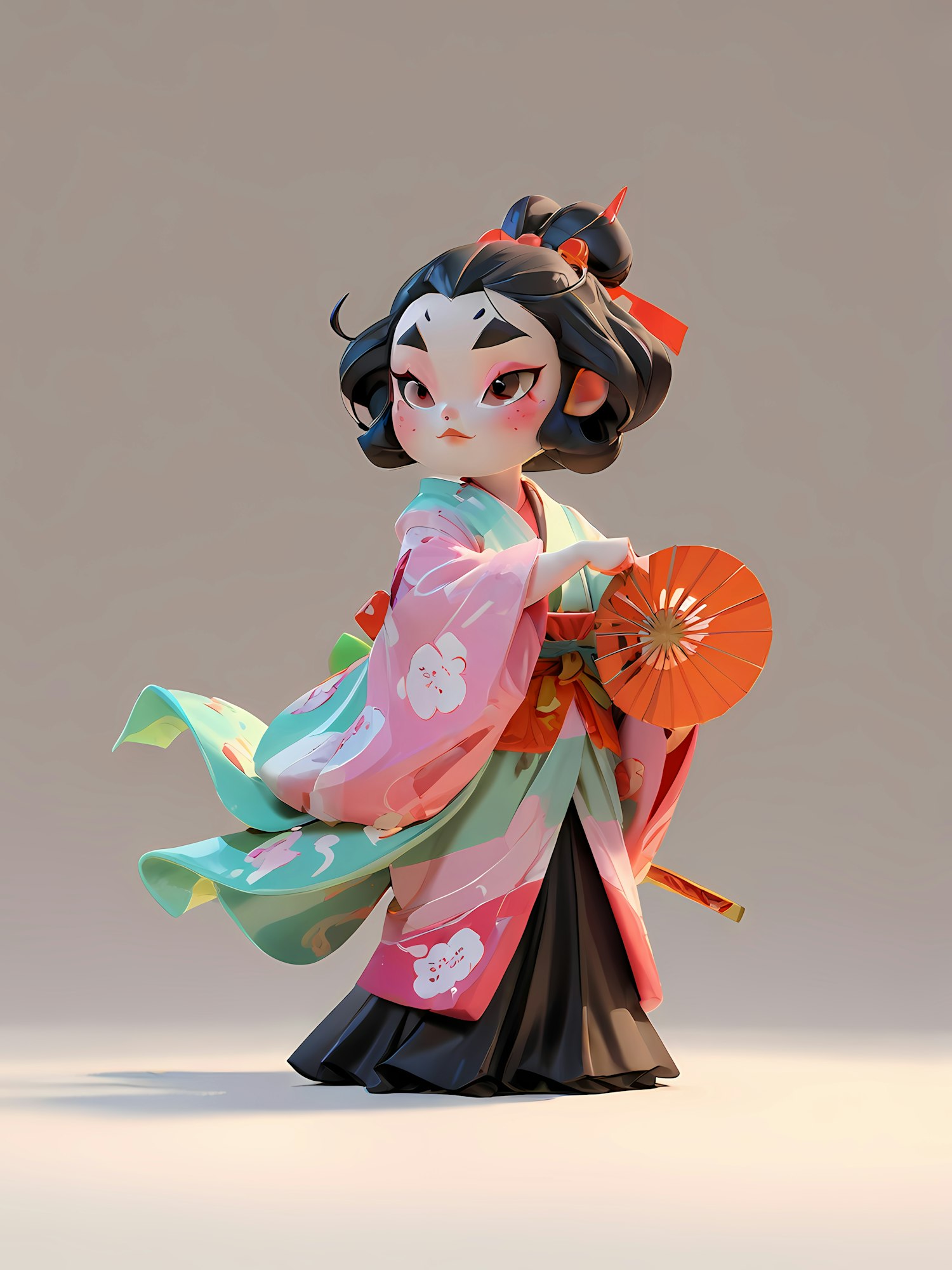 Stylized 3D anime-inspired girl in a vibrant floral kimono holding a parasol, showcasing intricate details and a graceful pose.