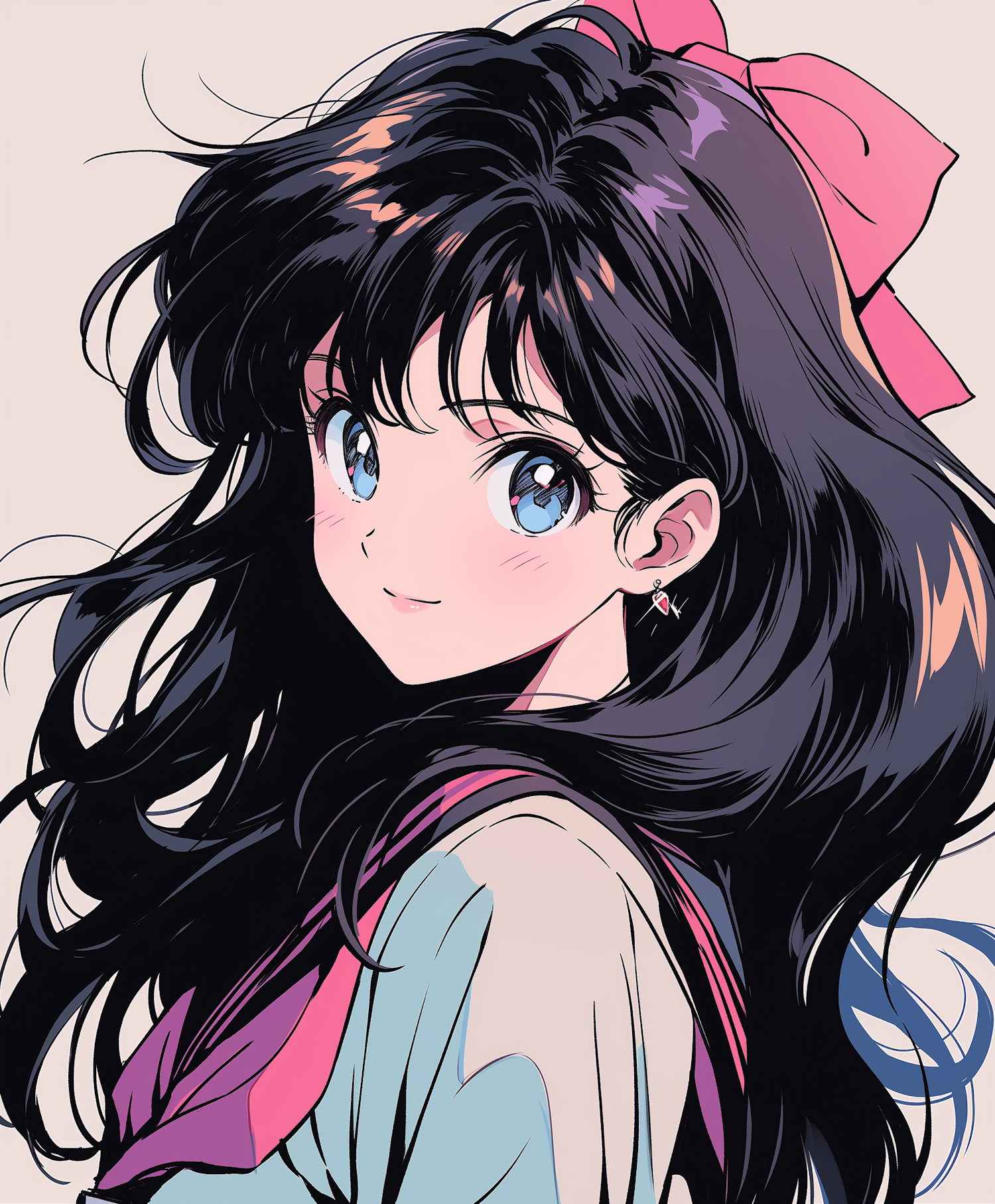 Anime-style illustration of a young woman with flowing black hair, blue eyes, and a pink bow, radiating charm and elegance.
