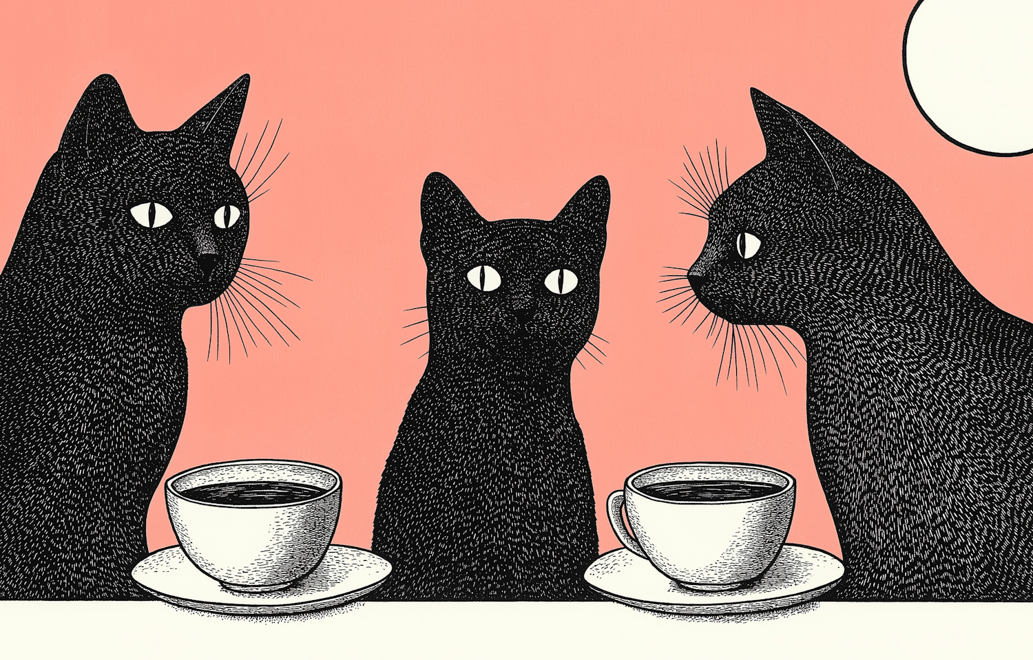 Three black cats with coffee cups on a pink background, illustrated with intricate line work and a whimsical style.