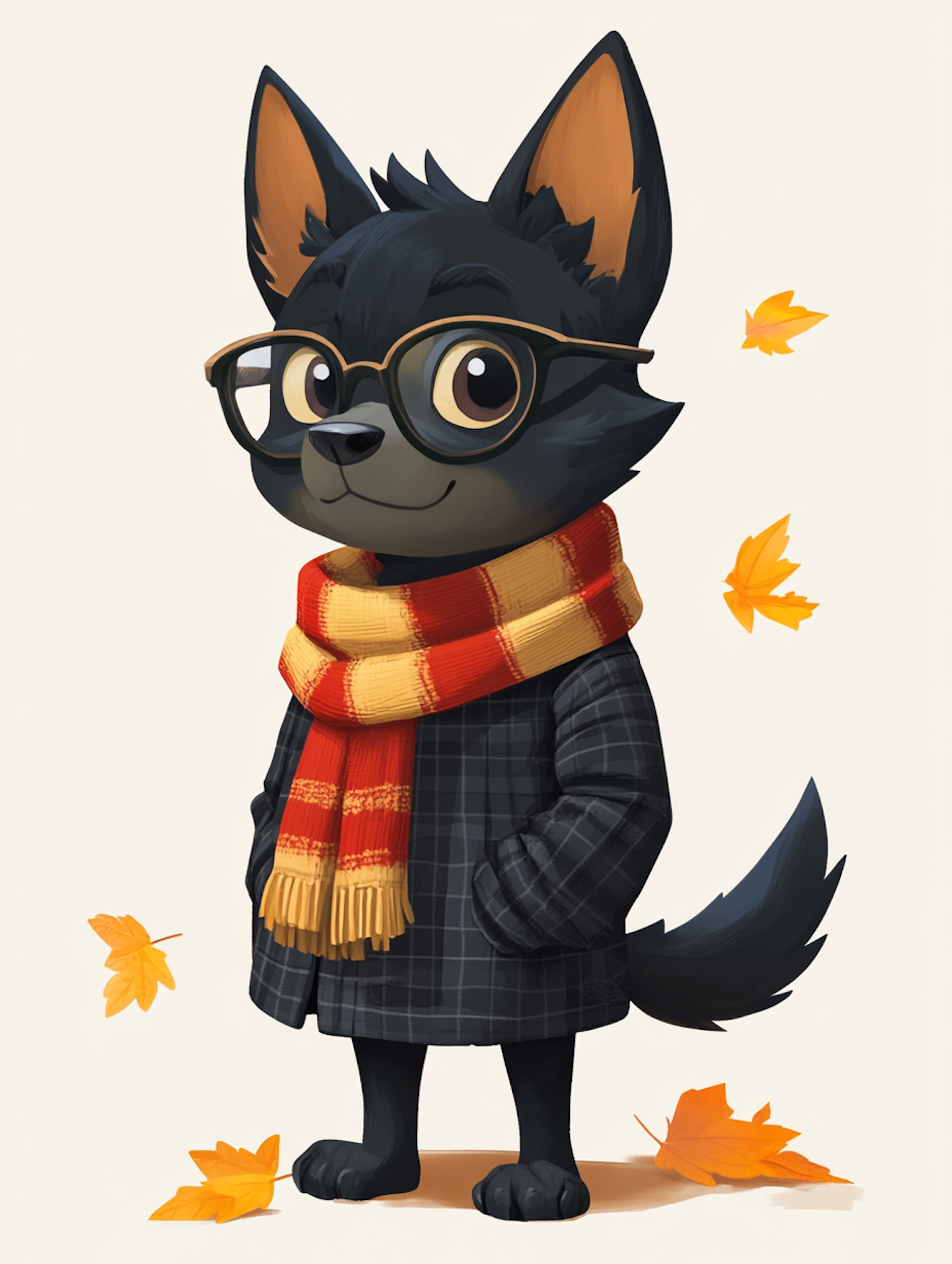 Adorable cartoon dog in glasses, plaid coat, and scarf, surrounded by autumn leaves. Perfect for a cozy fall vibe.