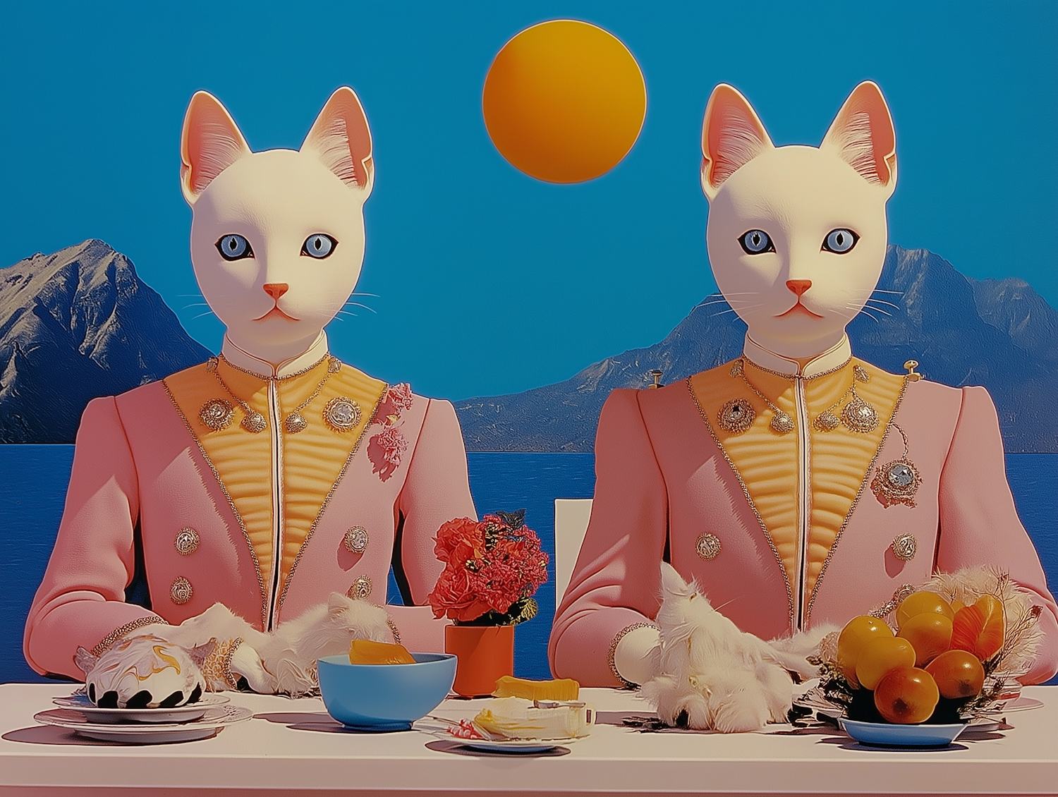 Two anthropomorphic cats in pink uniforms sit at a table with desserts and fruit, set against a surreal mountain and lake backdrop.