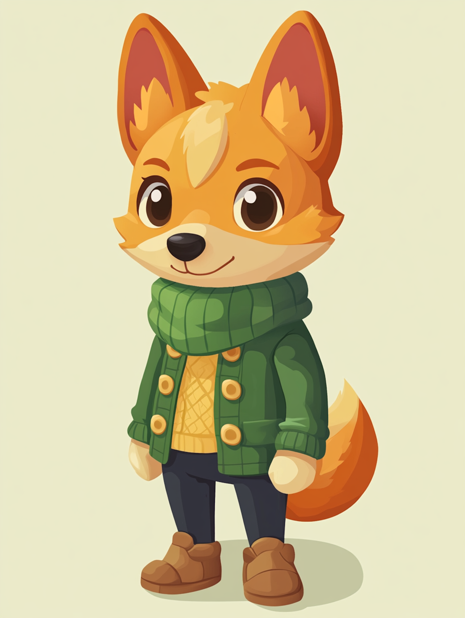 Adorable cartoon fox in a green sweater and brown shoes, standing upright with a friendly expression. Perfect for children's illustrations.