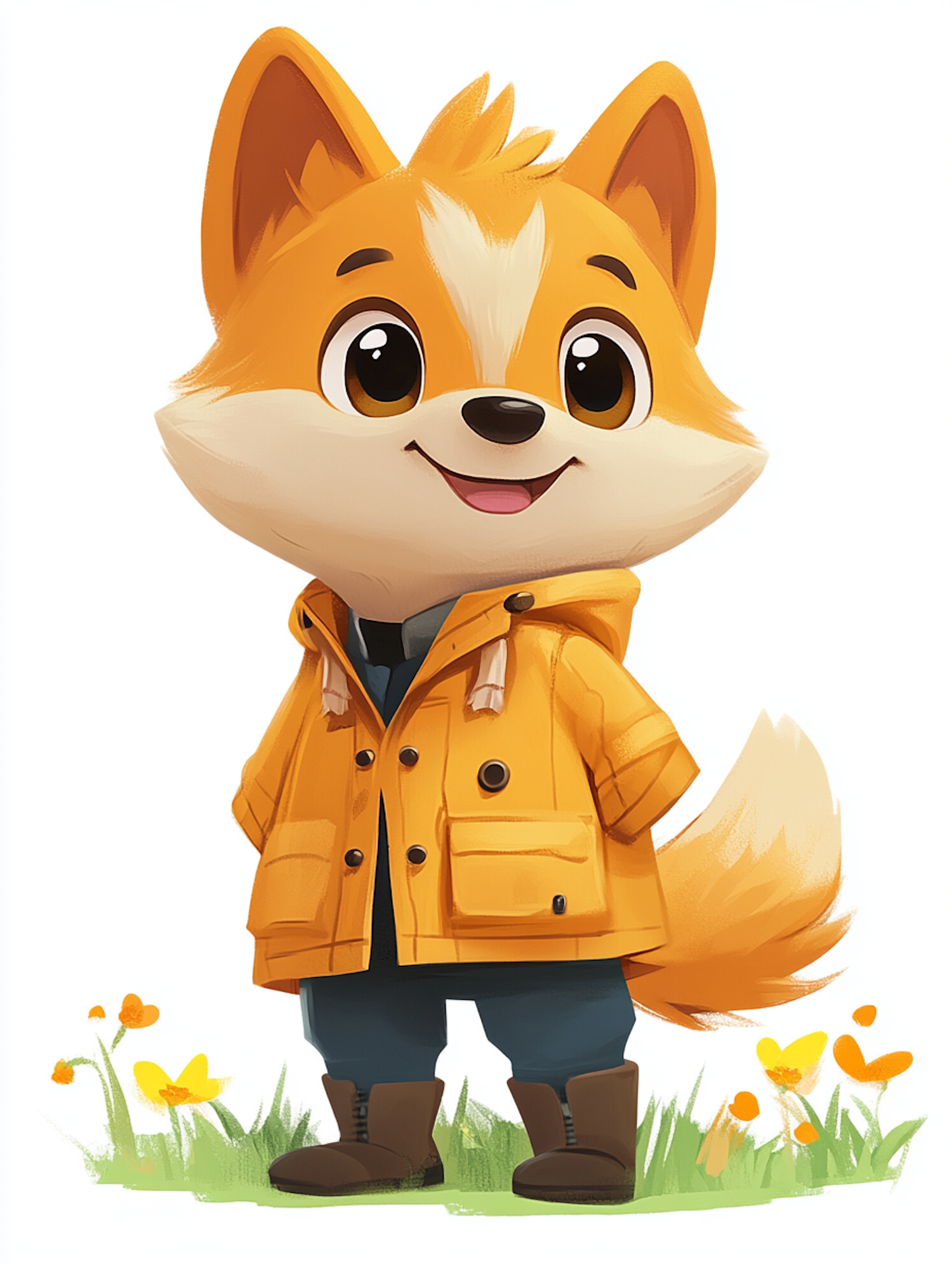 Adorable cartoon fox in a yellow raincoat, standing on grass with flowers. Bright orange fur and big eyes add to its charm.