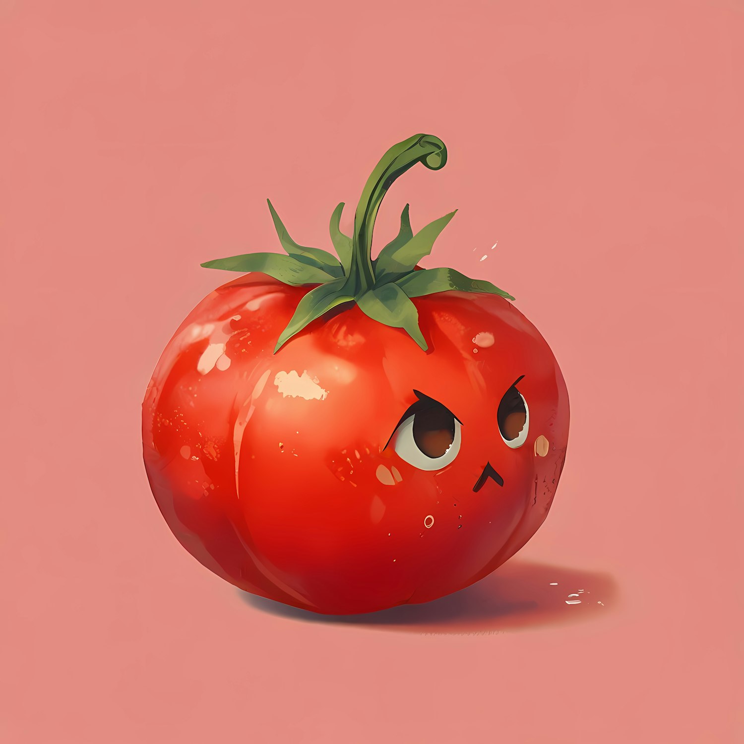 Whimsical cartoon tomato with an angry expression on a pink background, featuring glossy red skin and stylized green leaves.
