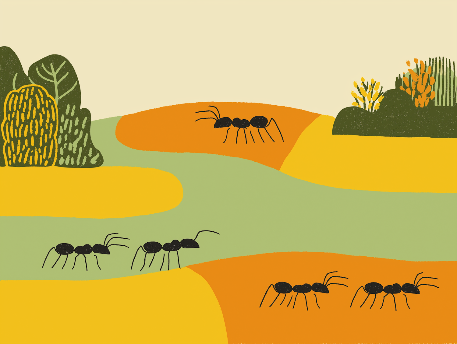 A charming illustration of ants walking across a colorful, abstract landscape with greenery and warm earthy tones.