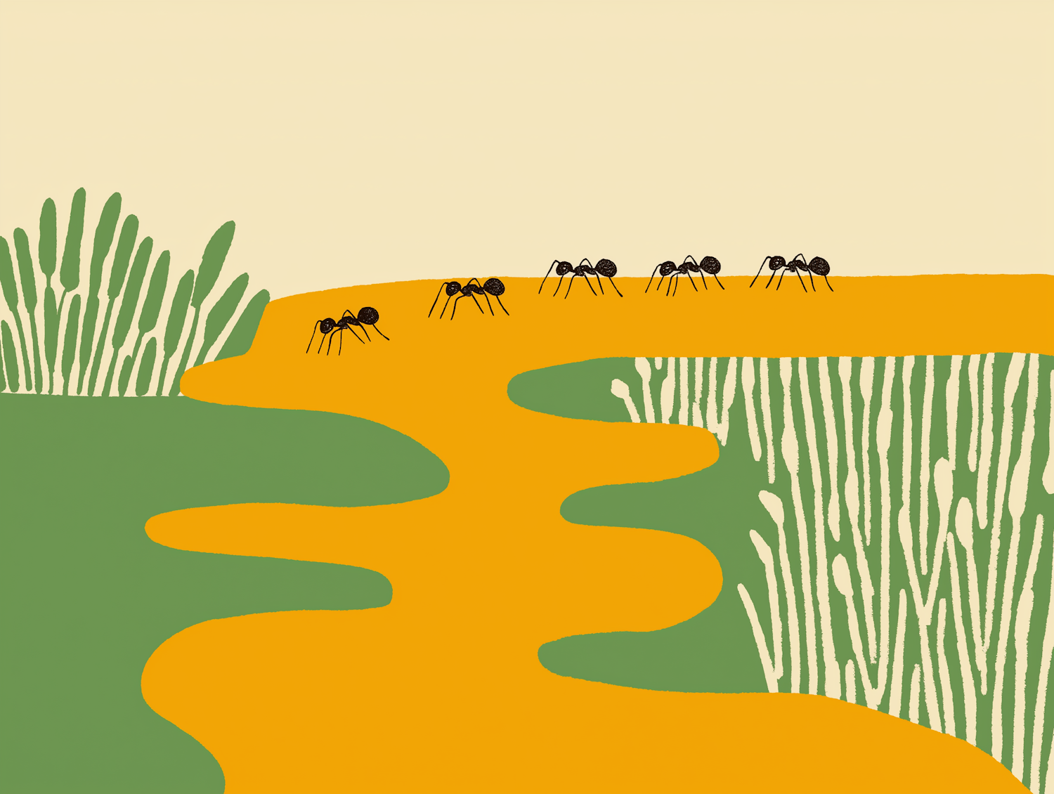 Stylized illustration of ants walking on a yellow path surrounded by abstract green vegetation, showcasing a minimalistic nature theme.
