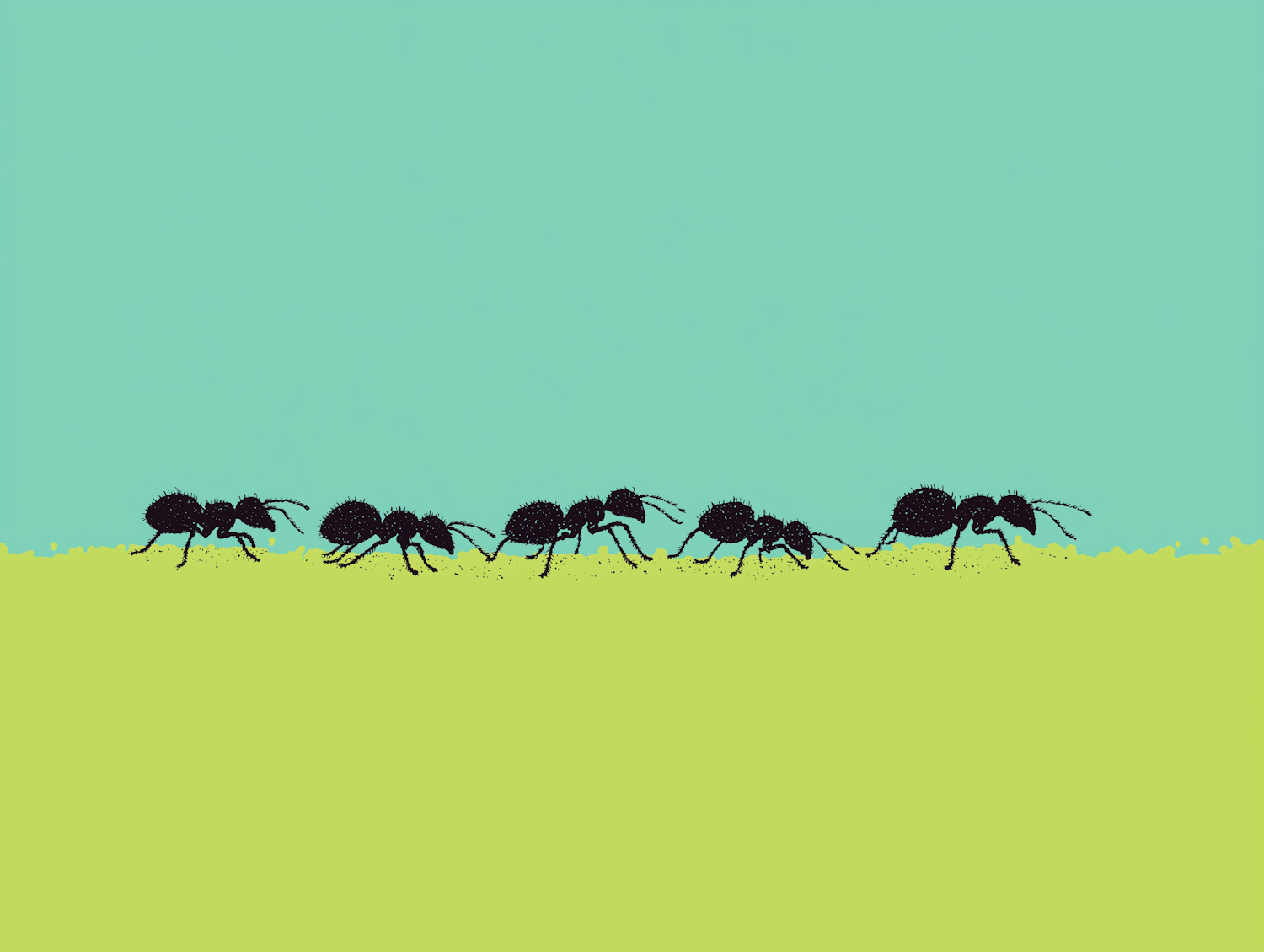 A minimalist illustration of ants walking in a line on a vibrant green surface with a cyan background, showcasing bold colors and clean design.