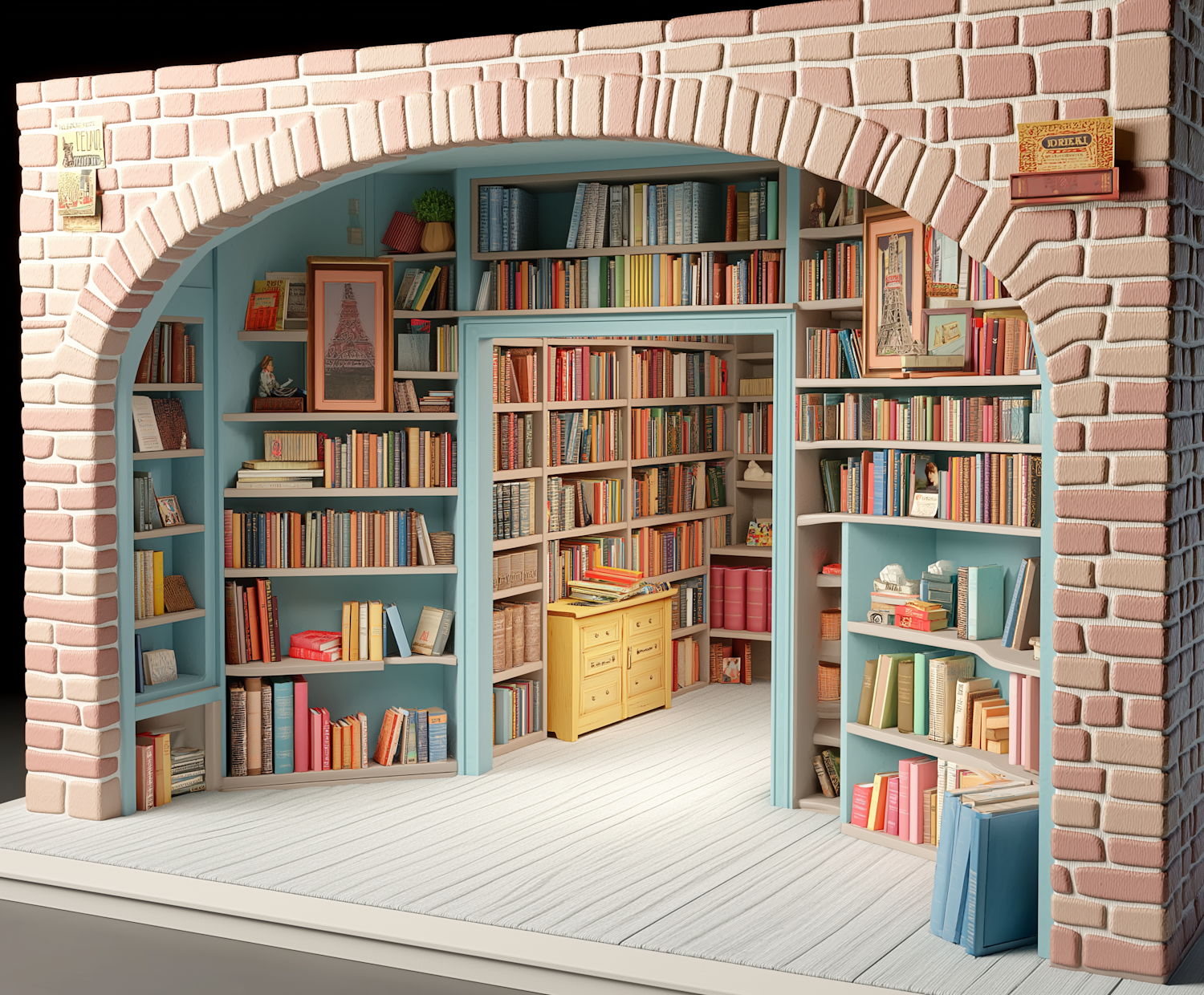 Arched Bookshelf Alcove with Pastel Bricks