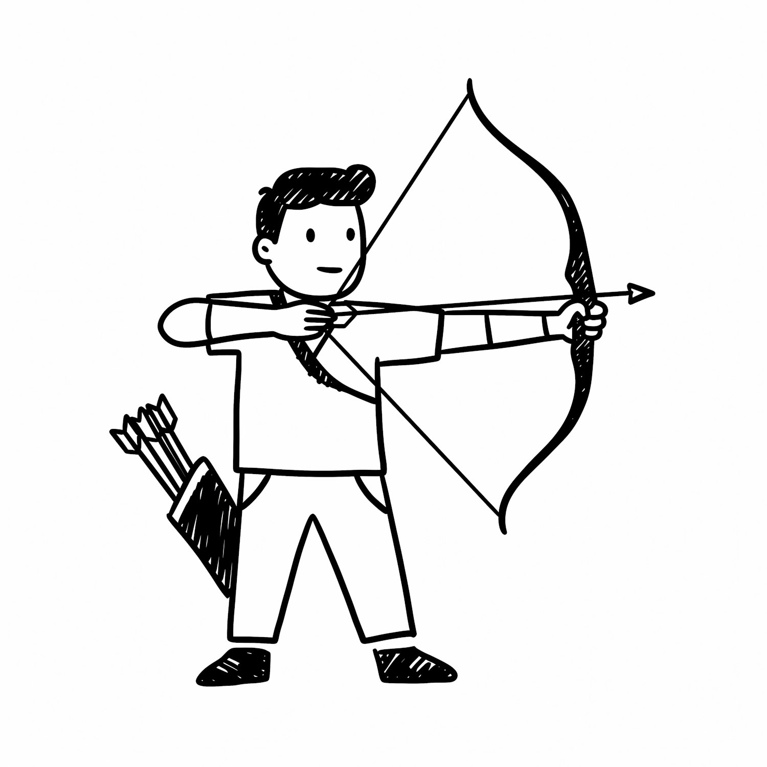 A simple black-and-white cartoon illustration of a person drawing a bow and aiming an arrow, with a quiver of arrows on their back.