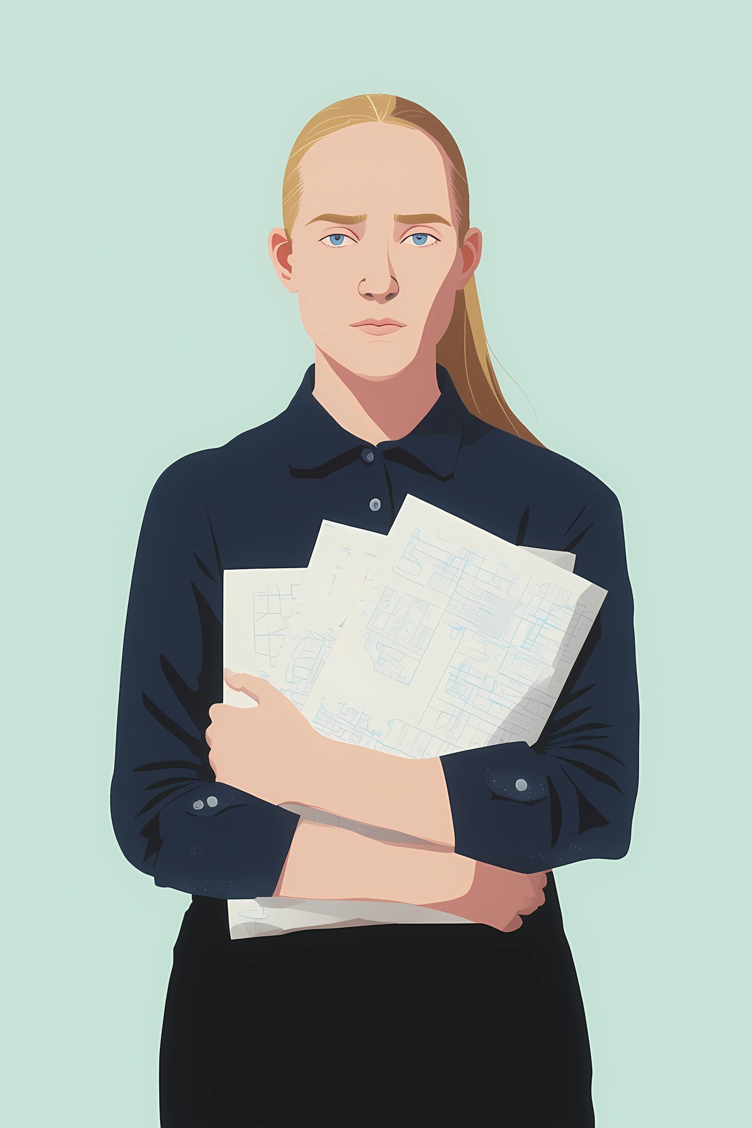 Illustration of a person holding blueprints, wearing a dark blue shirt, with a light green background, conveying a professional theme.