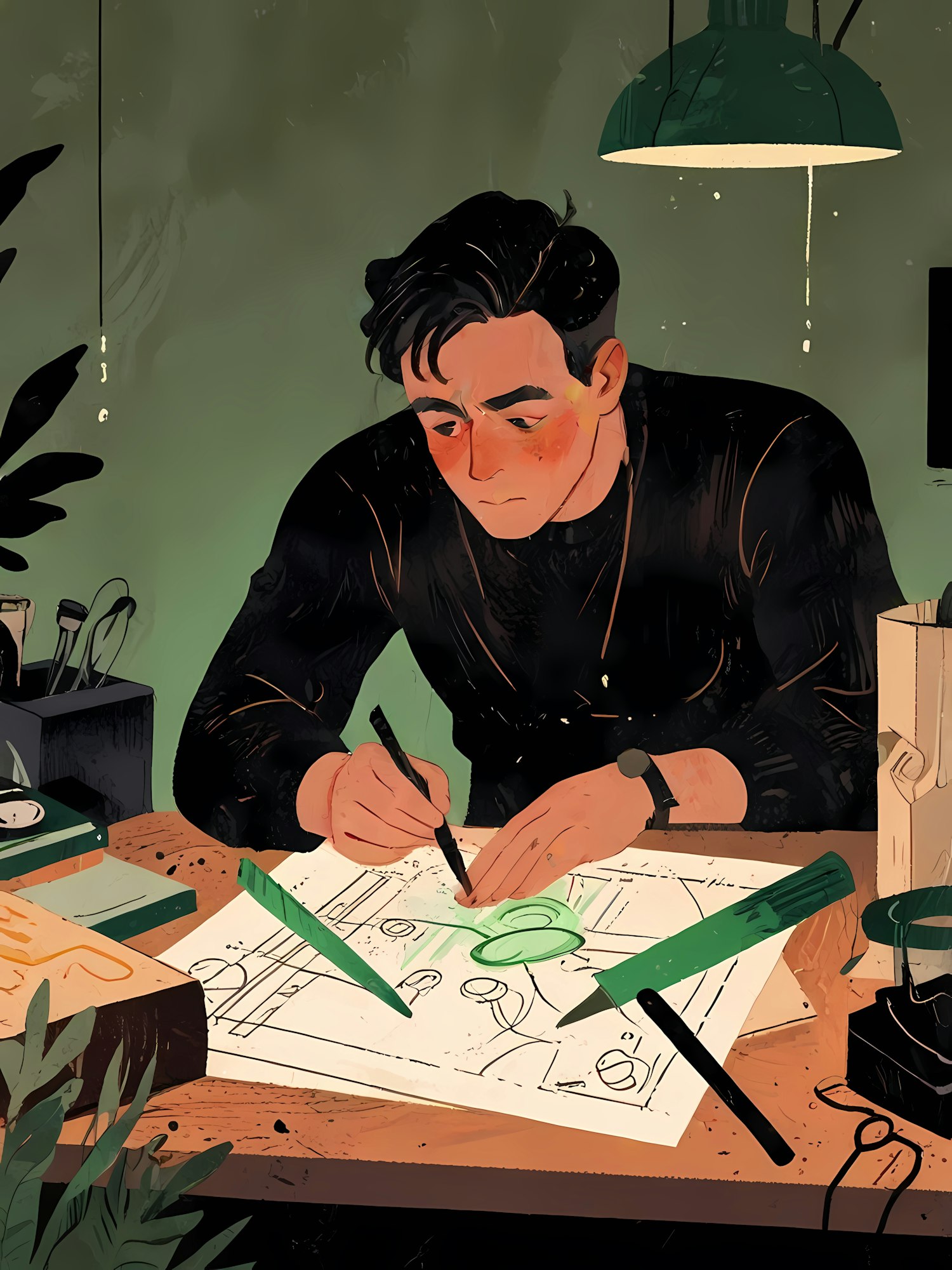 Illustration of a man sketching architectural plans at a desk, surrounded by drafting tools and a warm green lamp.