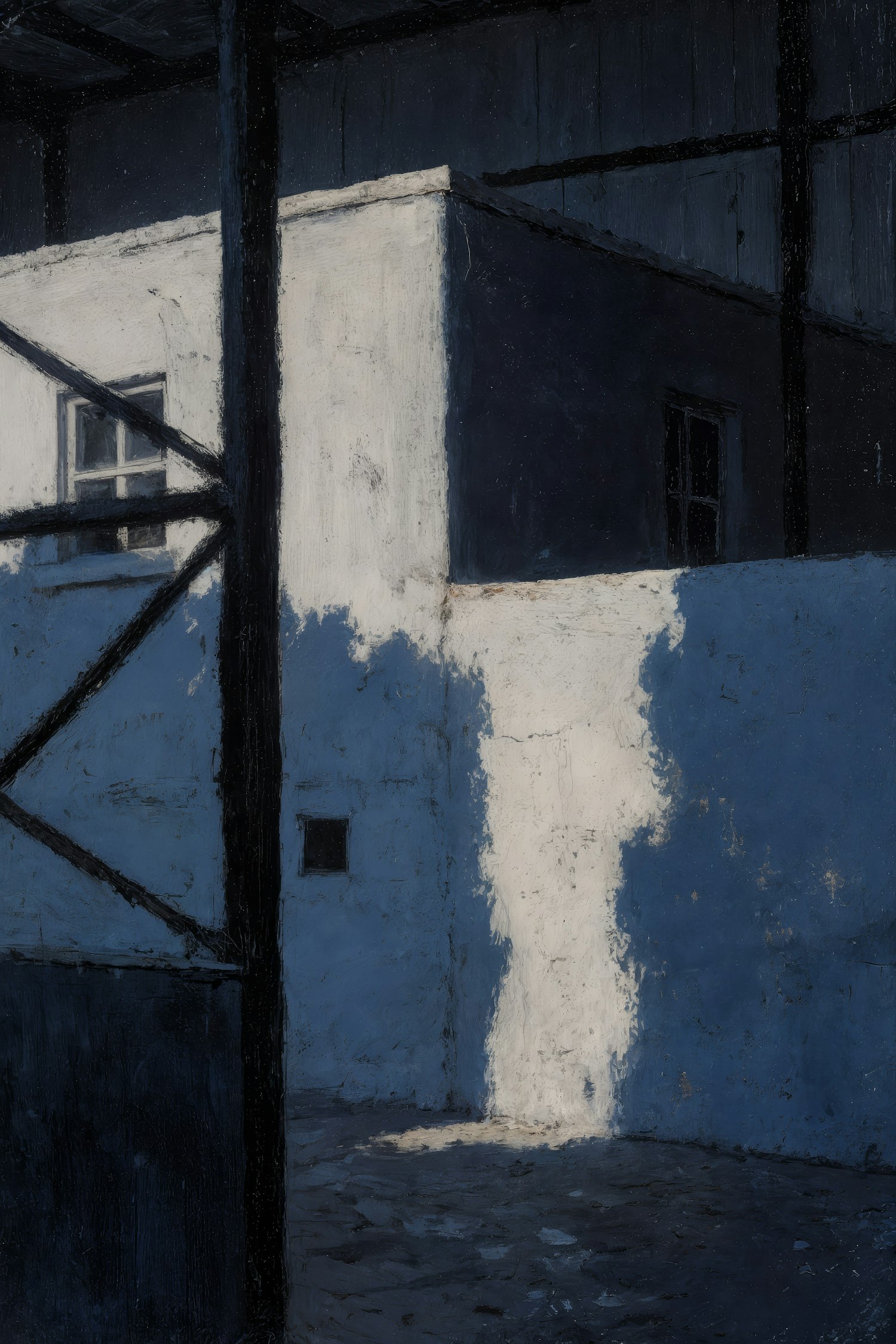 A minimalist architectural scene with white walls, black beams, and dramatic light and shadow contrasts, creating a serene and textured composition.
