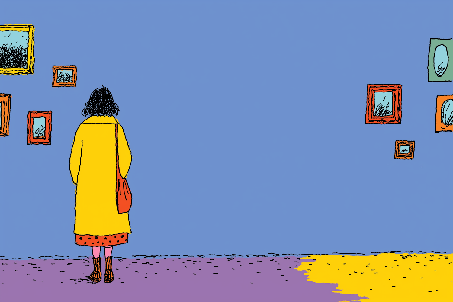 A vibrant illustration of a person in a yellow coat observing framed art on a blue wall, with a colorful floor adding contrast.