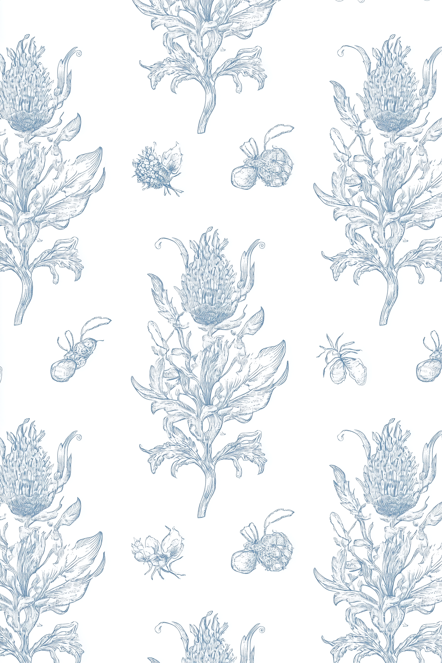 Elegant blue botanical artichoke illustrations on white, perfect for wallpaper or fabric with a classic and detailed aesthetic.