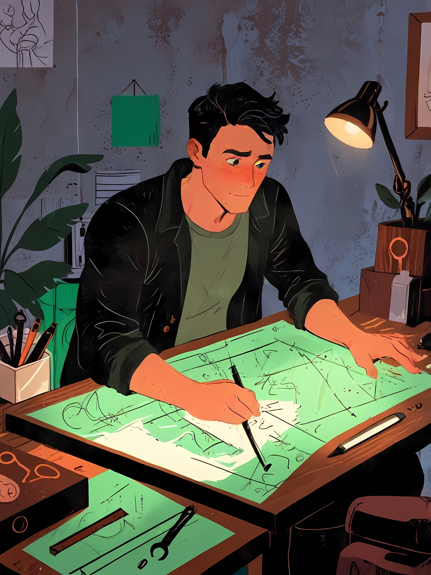 A young artist works intently at a green-lit drafting table, surrounded by art supplies and sketches in a cozy, creative workspace.