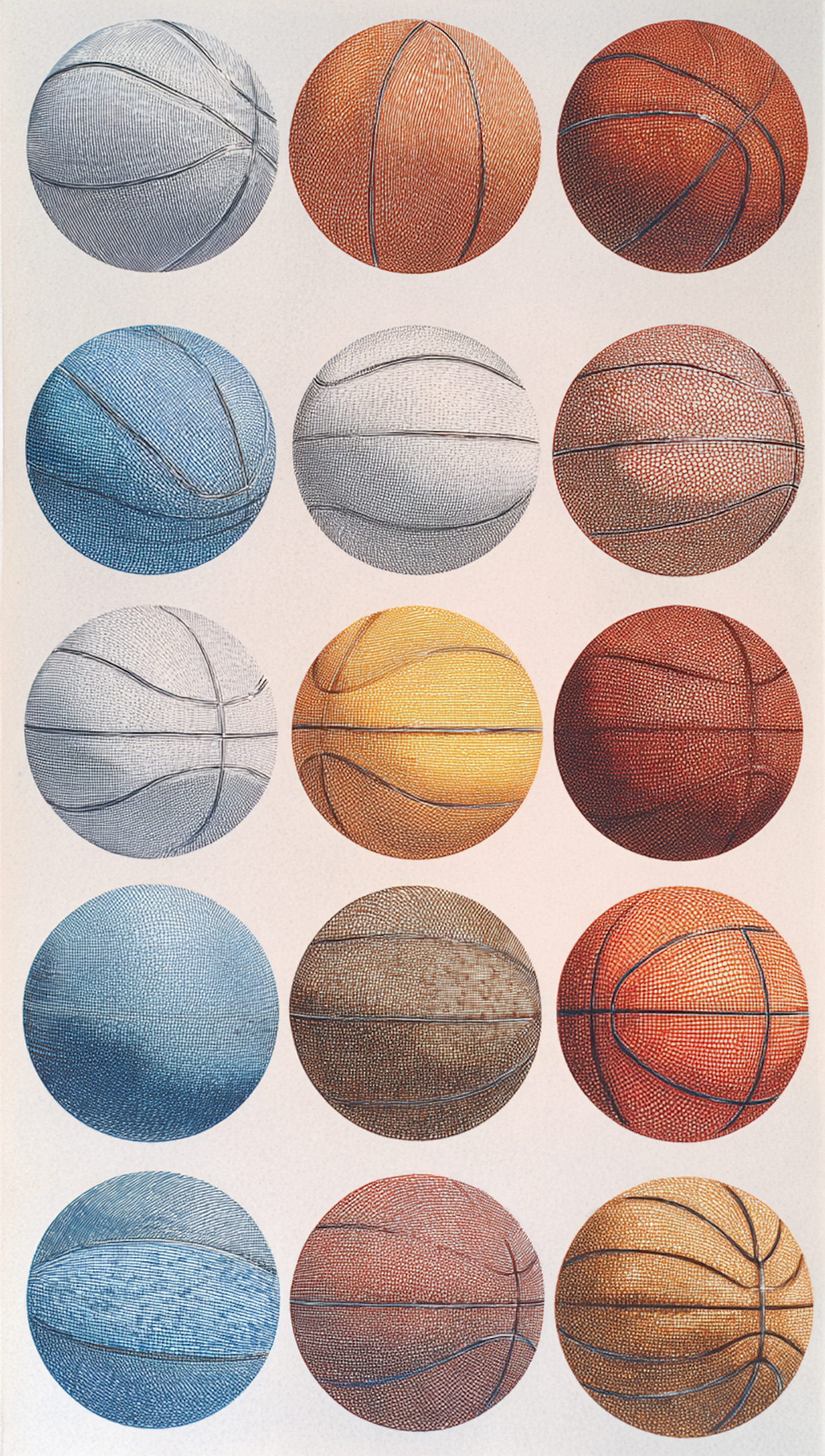 A vibrant grid of artistic basketballs displayed in unique colors, depicting detailed texture and design variations.