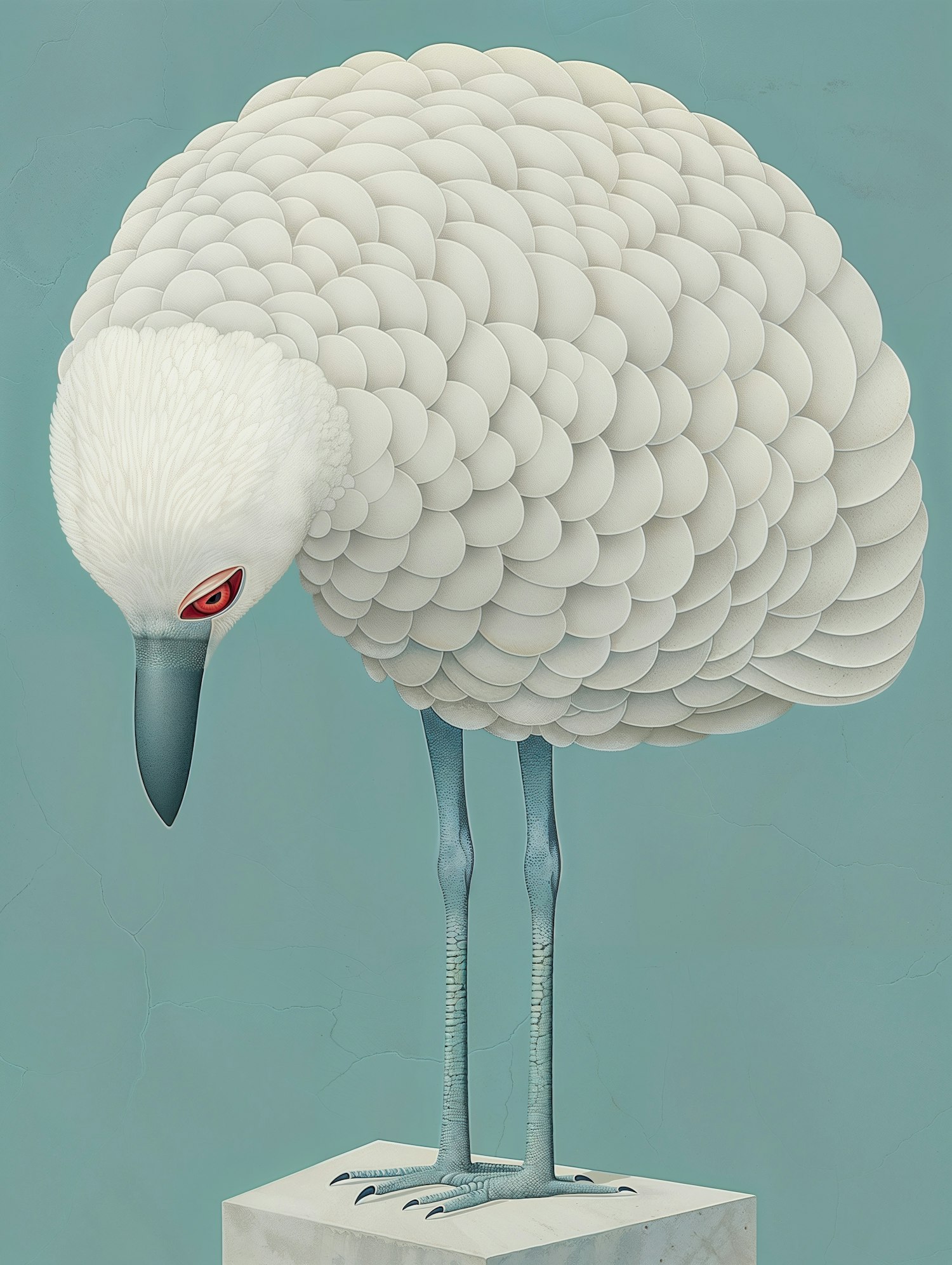 Stylized bird illustration with white textured feathers, red eyes, and teal legs, perched on a pedestal against a muted teal background.