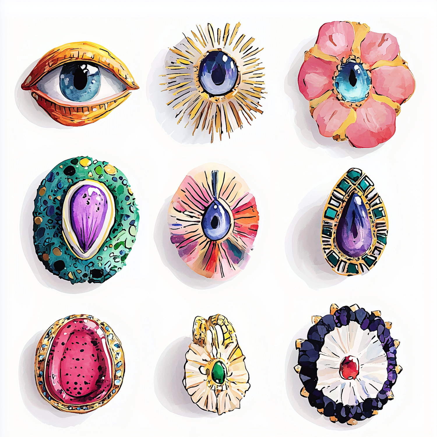 Nine artistic brooch designs in vibrant colors, featuring gemstones and intricate patterns, arranged in a 3x3 grid.