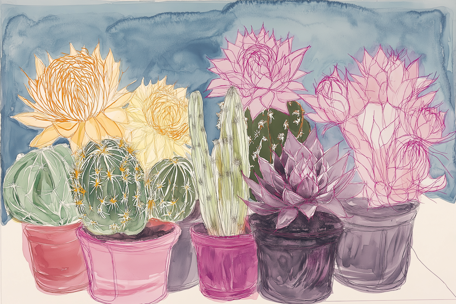 Colorful illustration of cacti and succulents in vibrant pots with blooming flowers against a soft blue background.