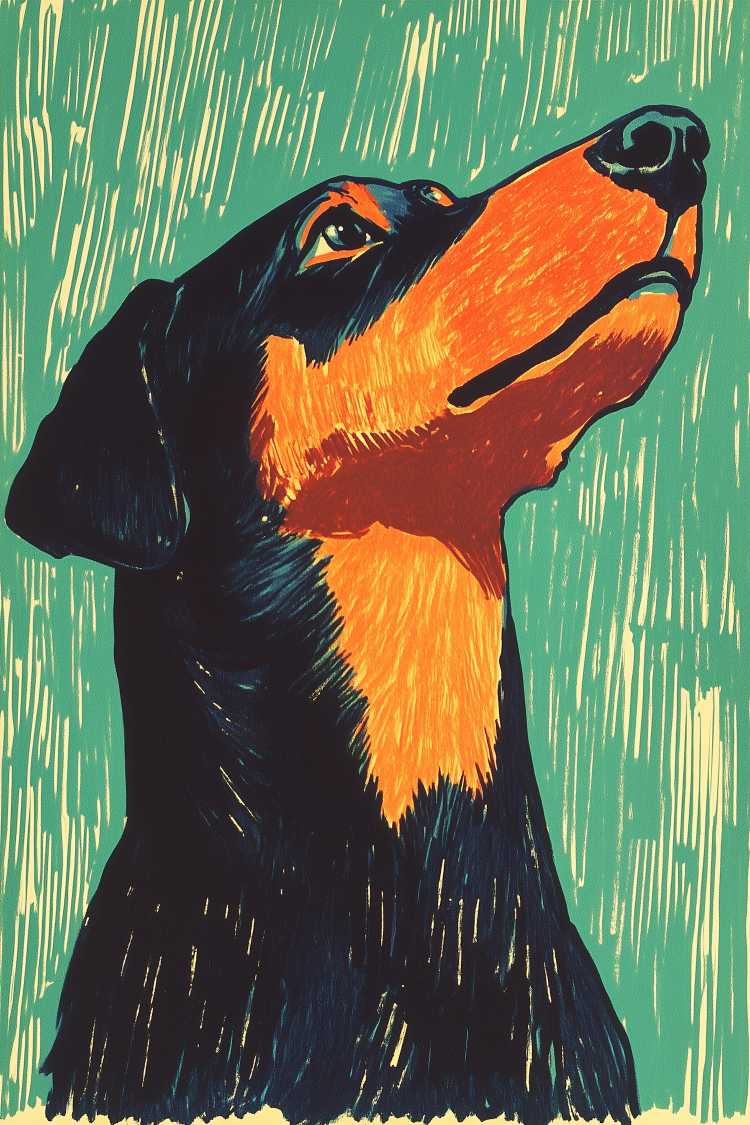 Bold illustration of a black and orange dog with a teal background, showcasing a modern artistic style and dynamic textures.