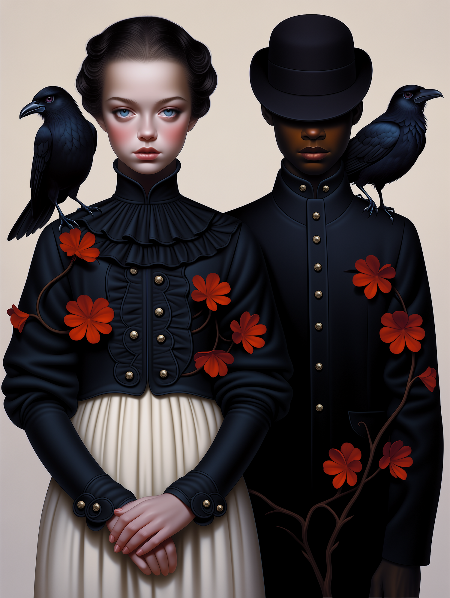 A striking artistic portrait of two individuals in black attire with red floral accents, accompanied by ravens, set against a neutral background.