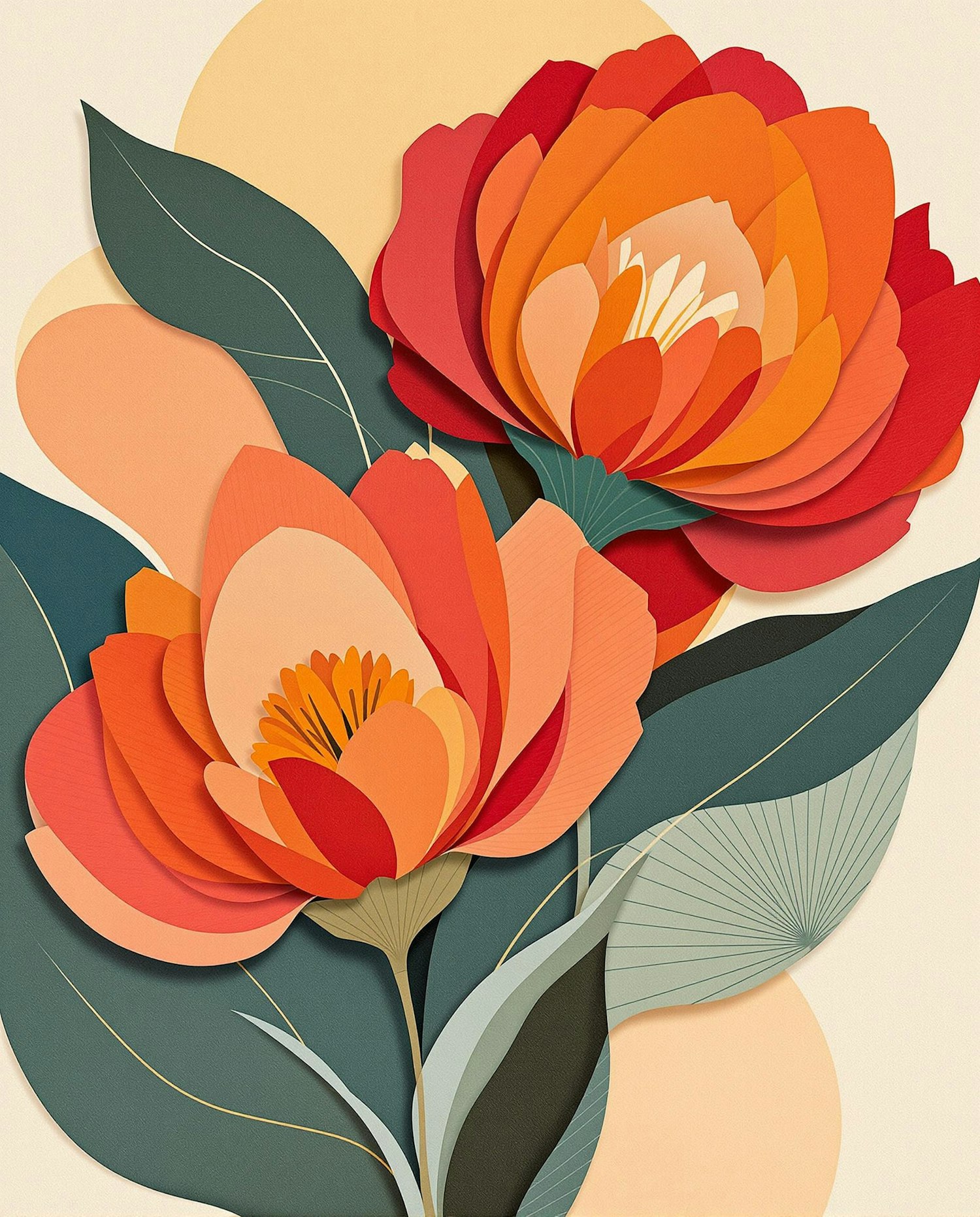 Paper cut collage effect depicting two stylized blooming flowers, asymmetrical yet balanced, with saturated warm tones (vermilion, salmon, ochre), smooth abstract curves, vintage modernist poster style