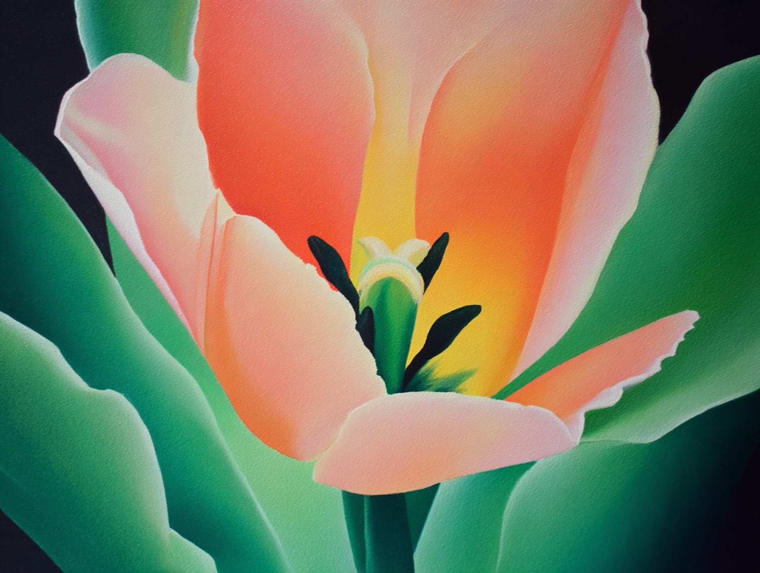 Illustration of a vibrant tulip, soft petals fading from pink to orange, surrounded by rich green leaves and set against a dark backdrop.