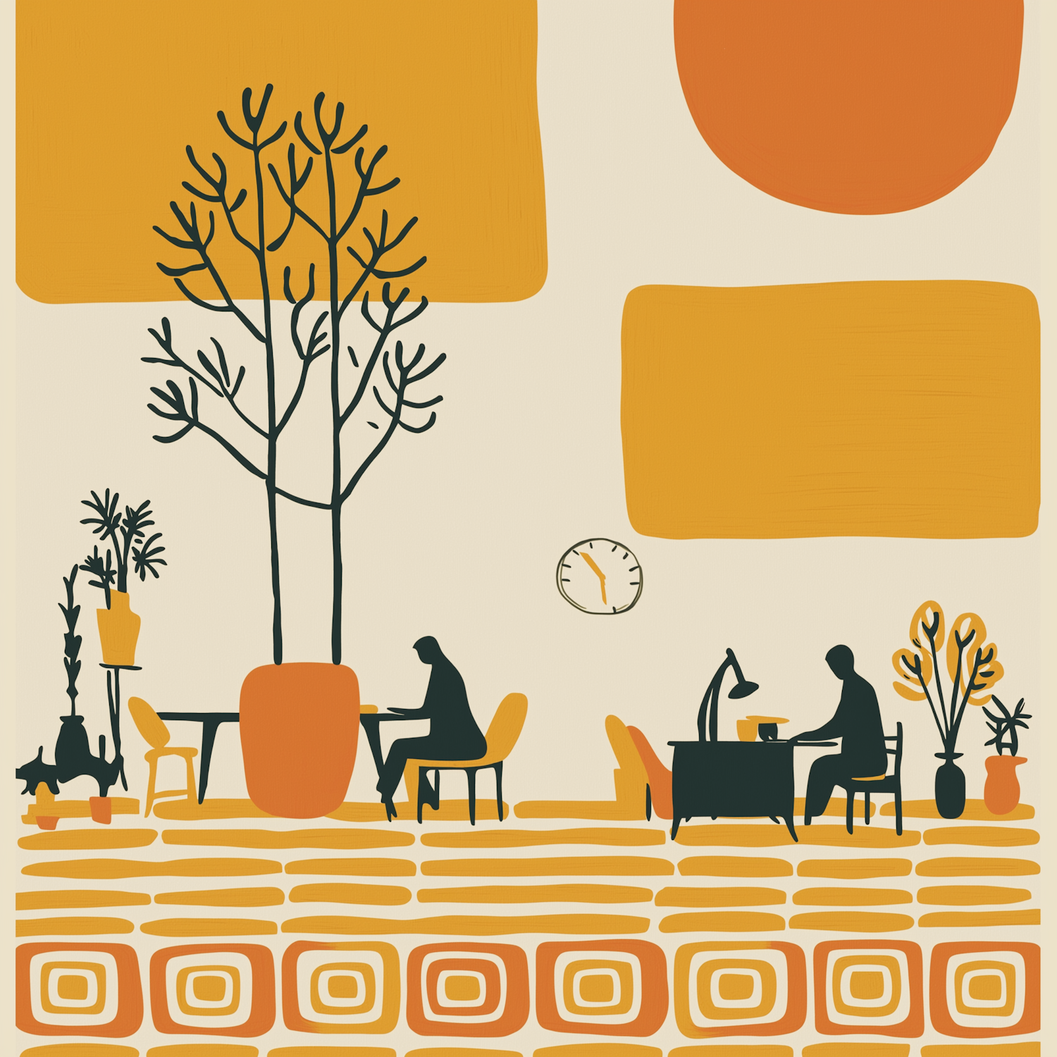 Stylized illustration of a workspace with abstract shapes, potted plants, and two individuals at desks in a warm, modern aesthetic.