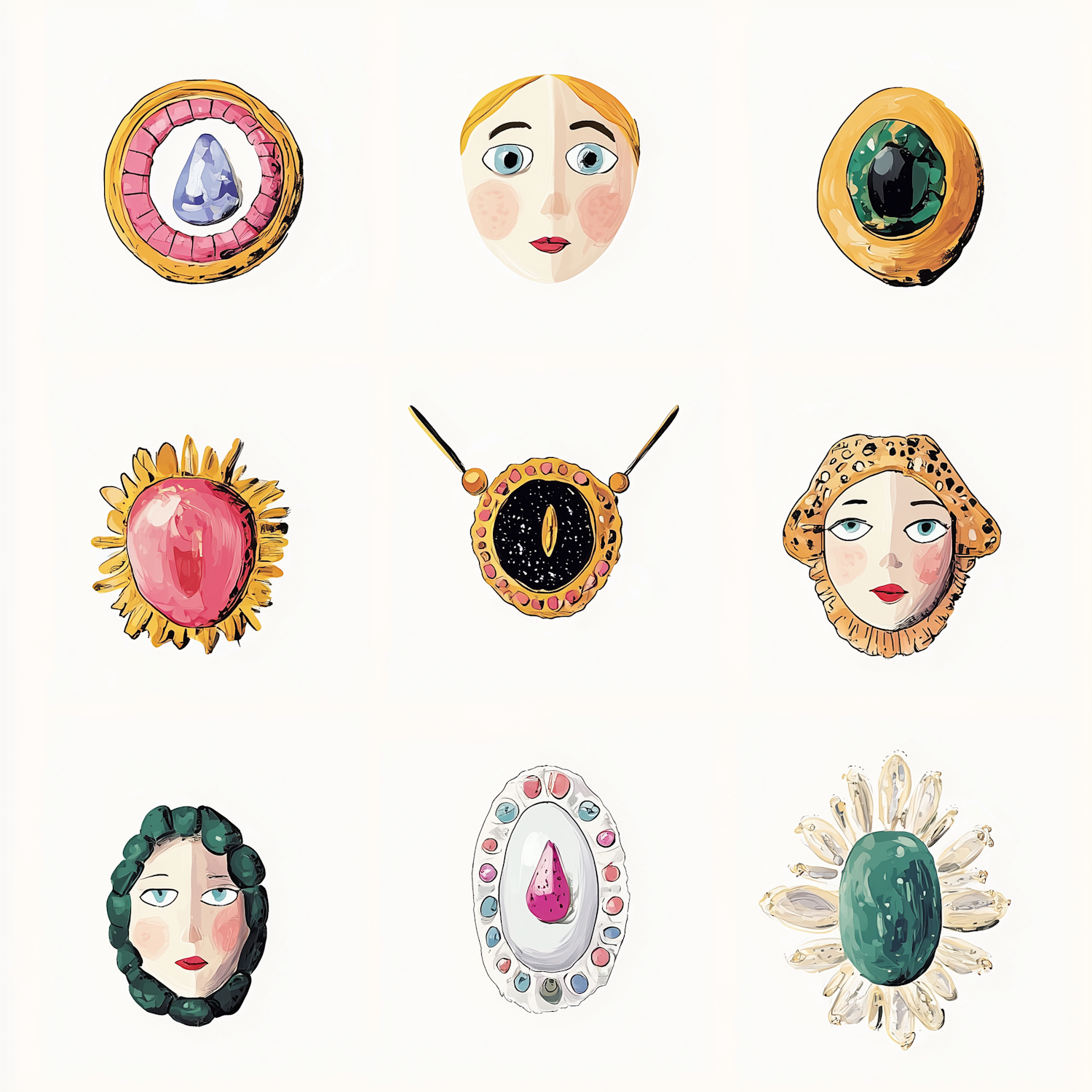 Whimsical grid of jewelry and face motifs, blending gemstones, gold, and artistic faces in a vibrant, illustrative style.