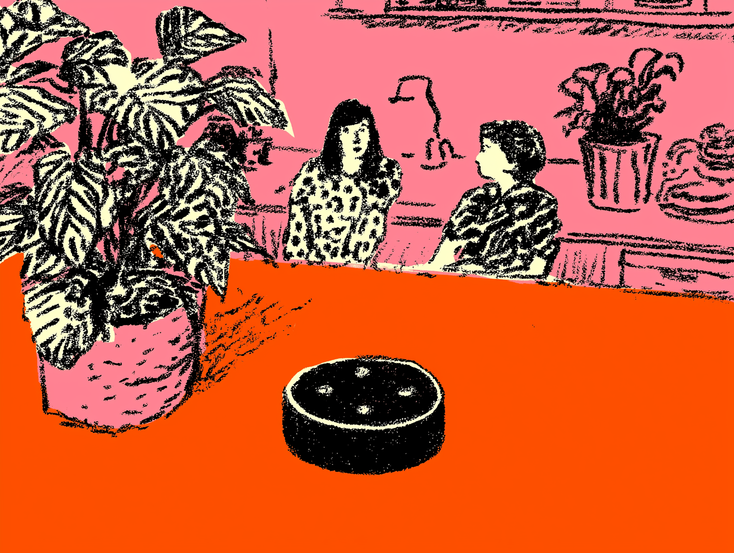 Bold illustration of a kitchen with a smart speaker, vibrant plants, and two people chatting in a pink and orange color scheme.