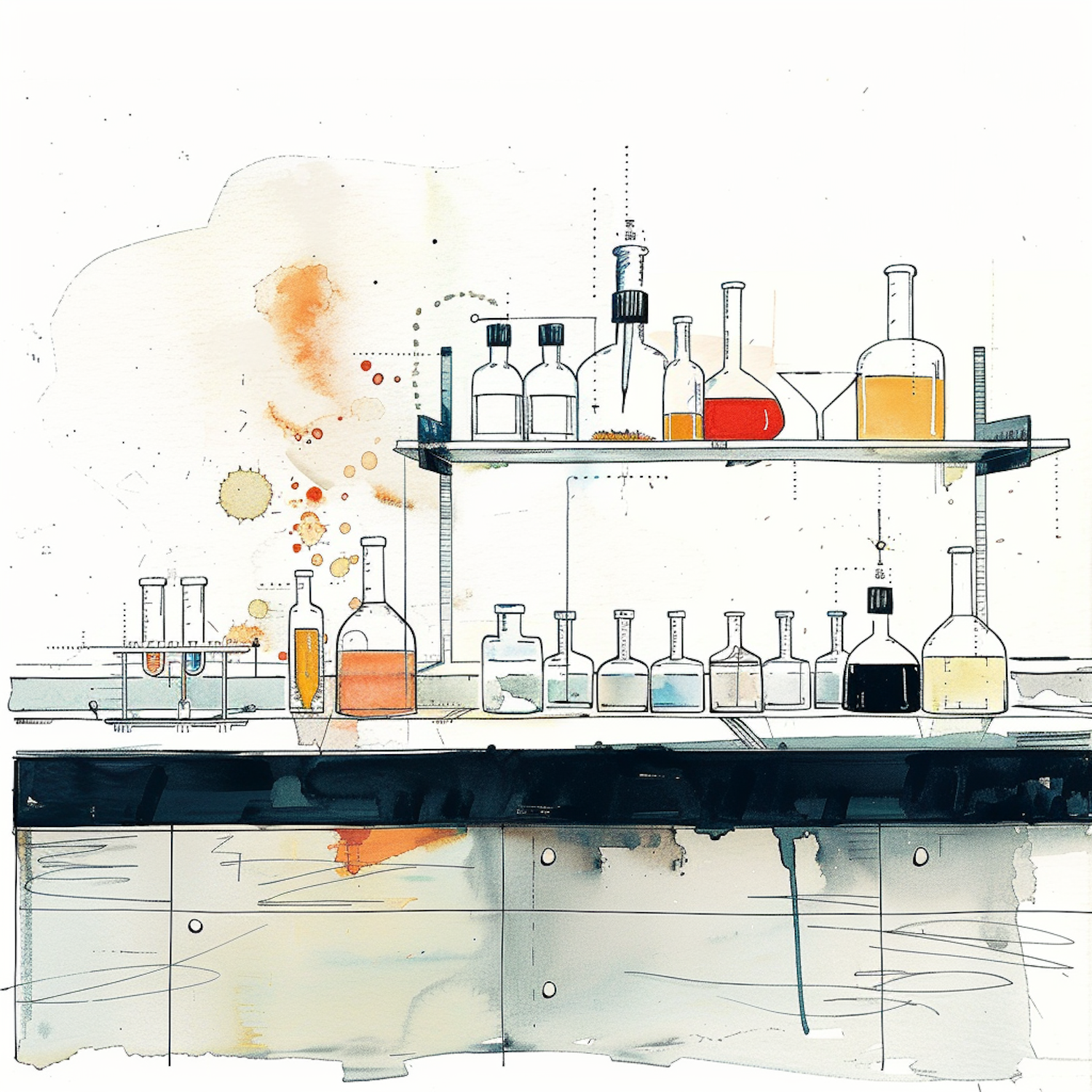Artistic illustration of a lab setup with colorful glass bottles, beakers, and watercolor splashes, blending science and creativity.