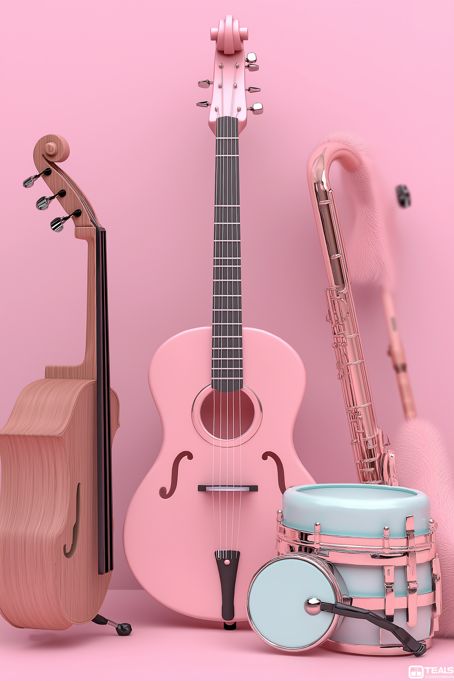 A pink-themed collection of musical instruments including a guitar, cello, saxophone, and drum against a pastel background.