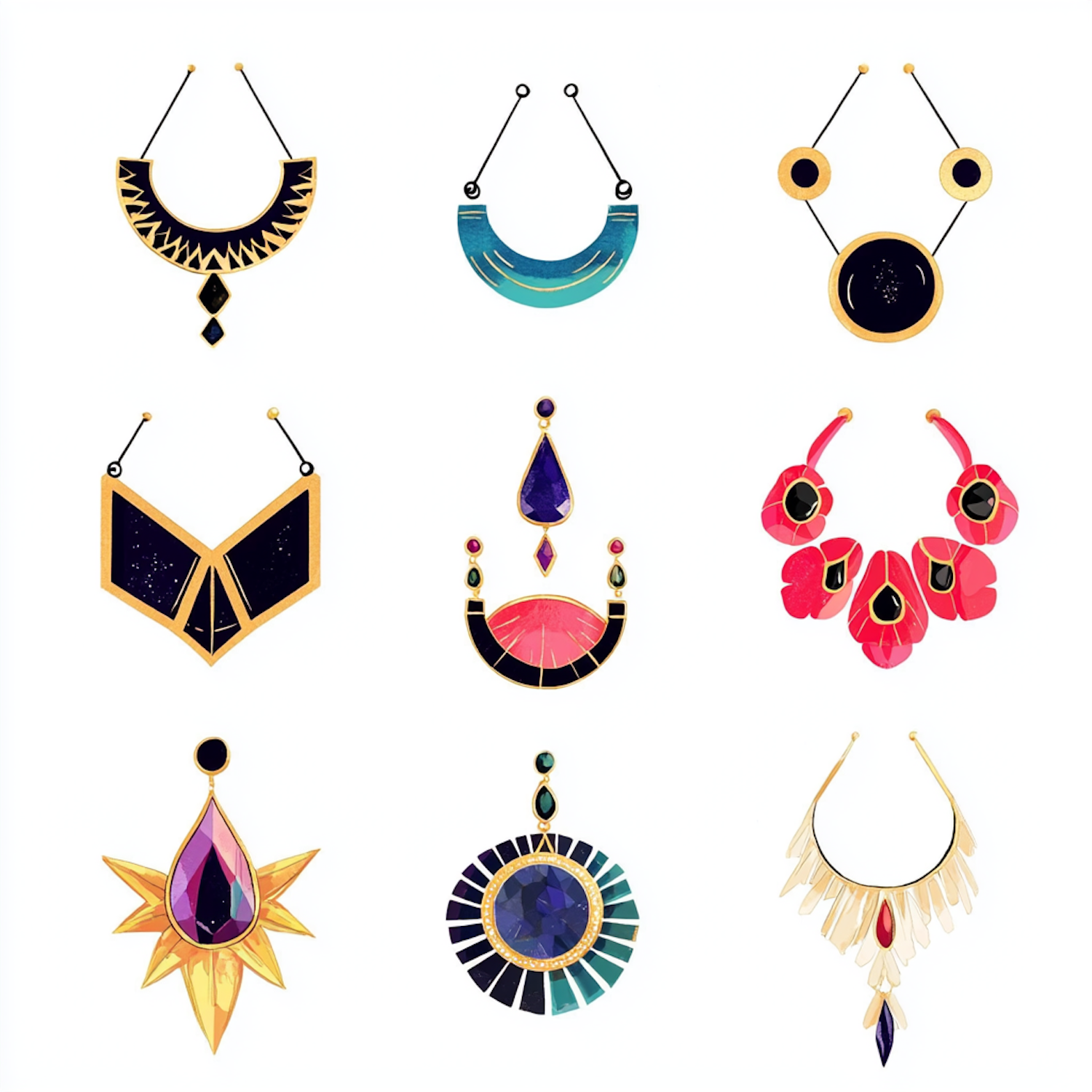 A stunning collection of 9 artistic necklaces with bold geometric, floral, and celestial designs in vibrant colors and gold accents.