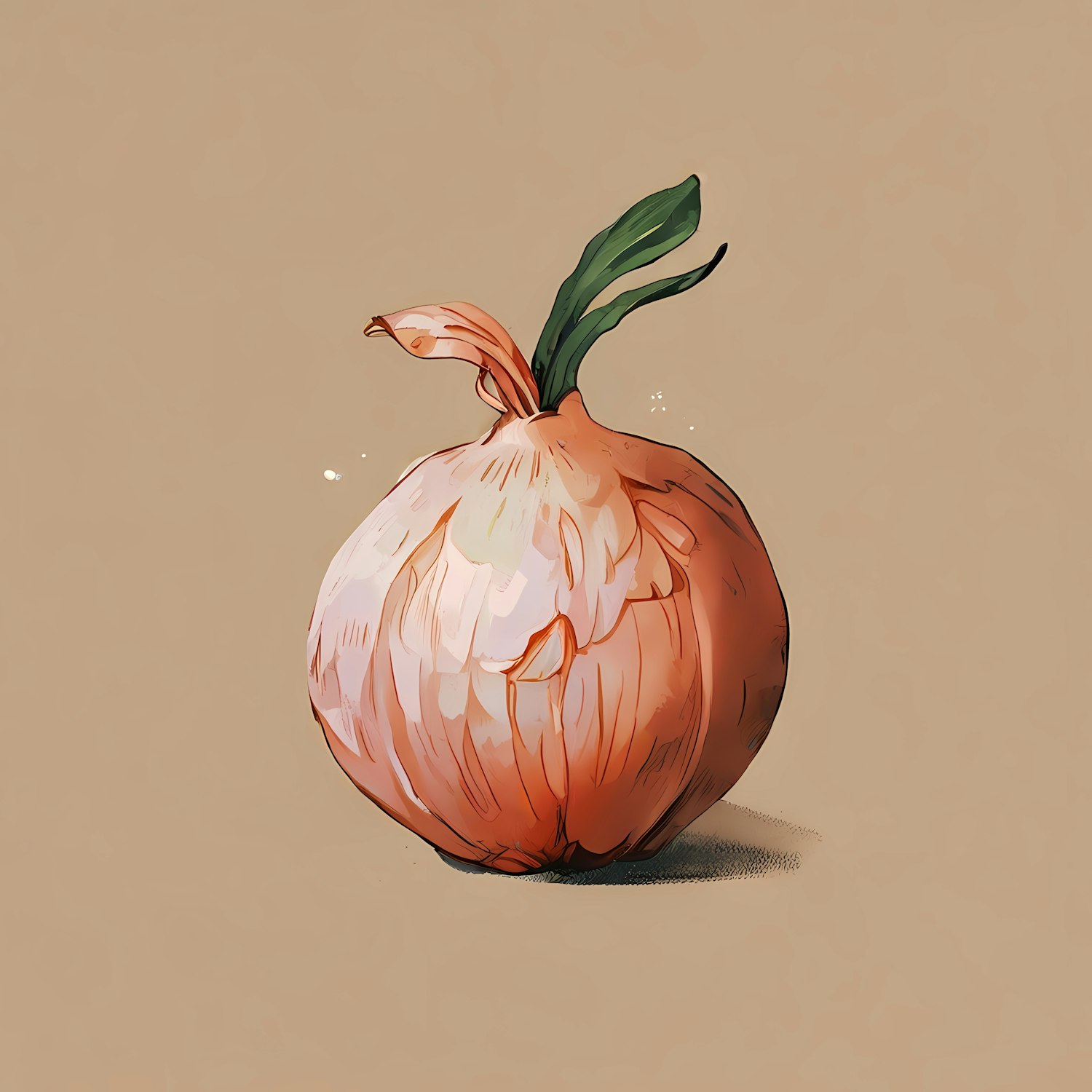 Stylized illustration of a single onion with green shoots on a beige background, highlighting texture and earthy tones.