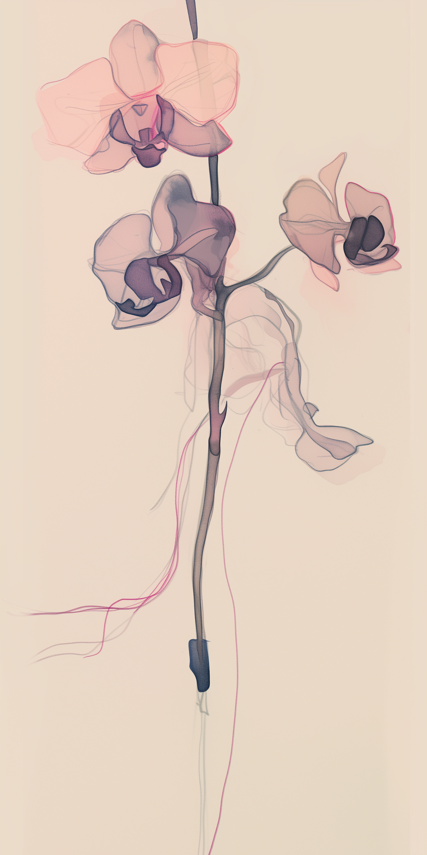 Elegant illustration of a delicate orchid with pastel pink and purple petals on a slender stem, set against a muted beige background.