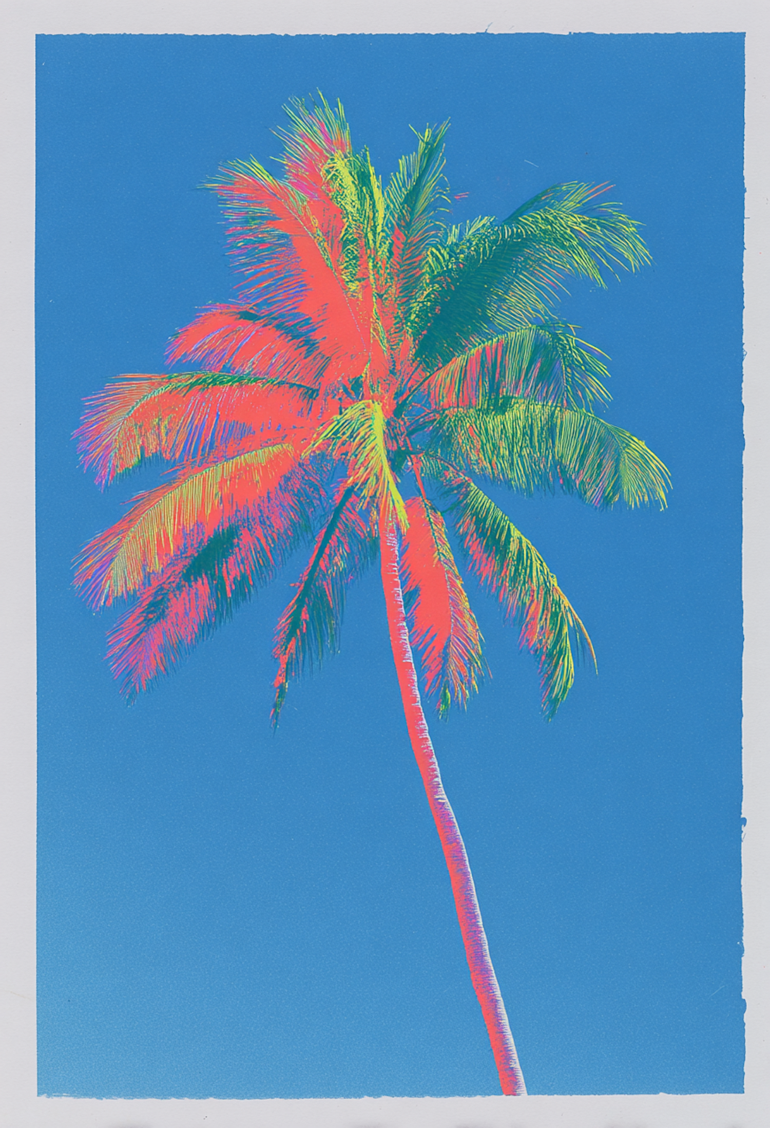 Colorful illustration of a palm tree under a bright blue sky, with vividly stylized green and pink hues.