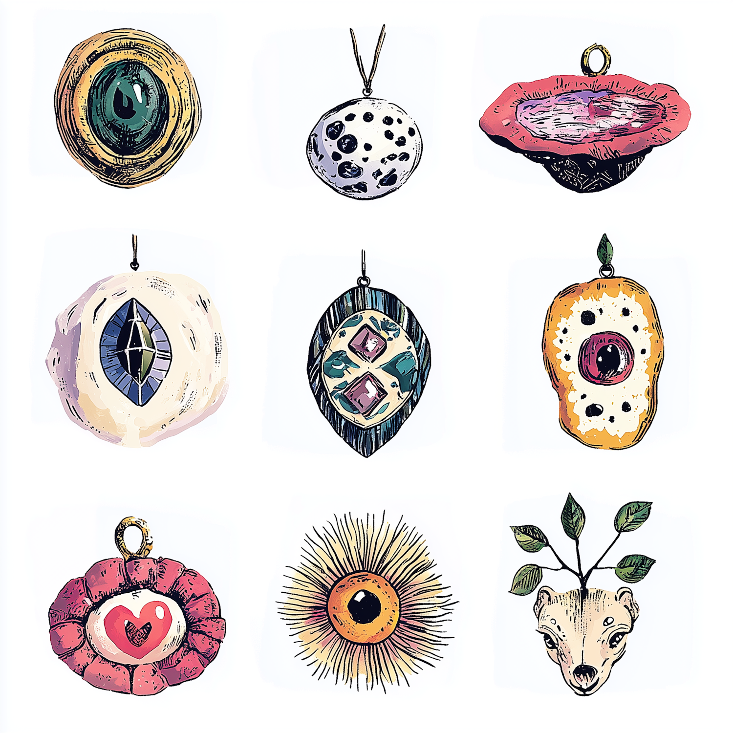 Nine artistic pendants with whimsical designs, featuring gemstones, floral patterns, and abstract shapes in vibrant colors.